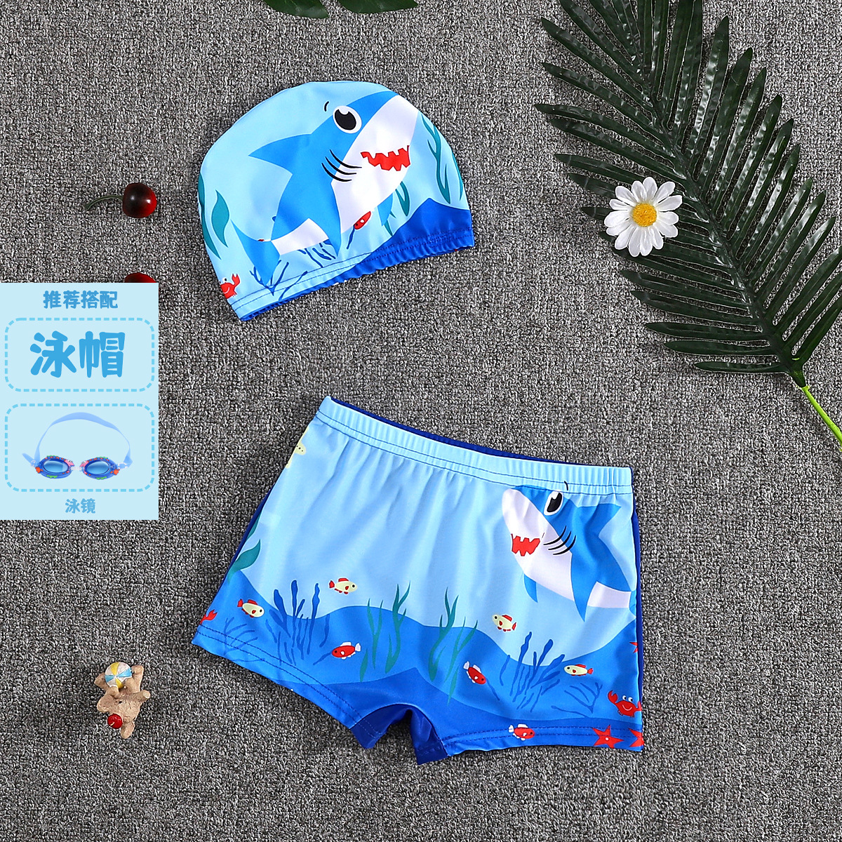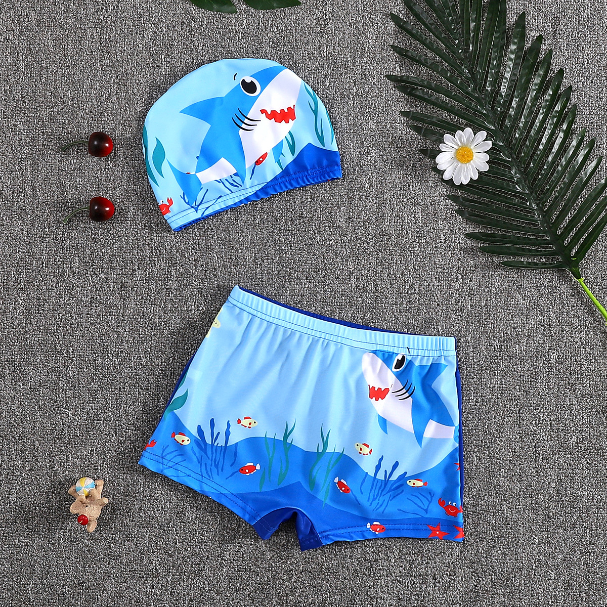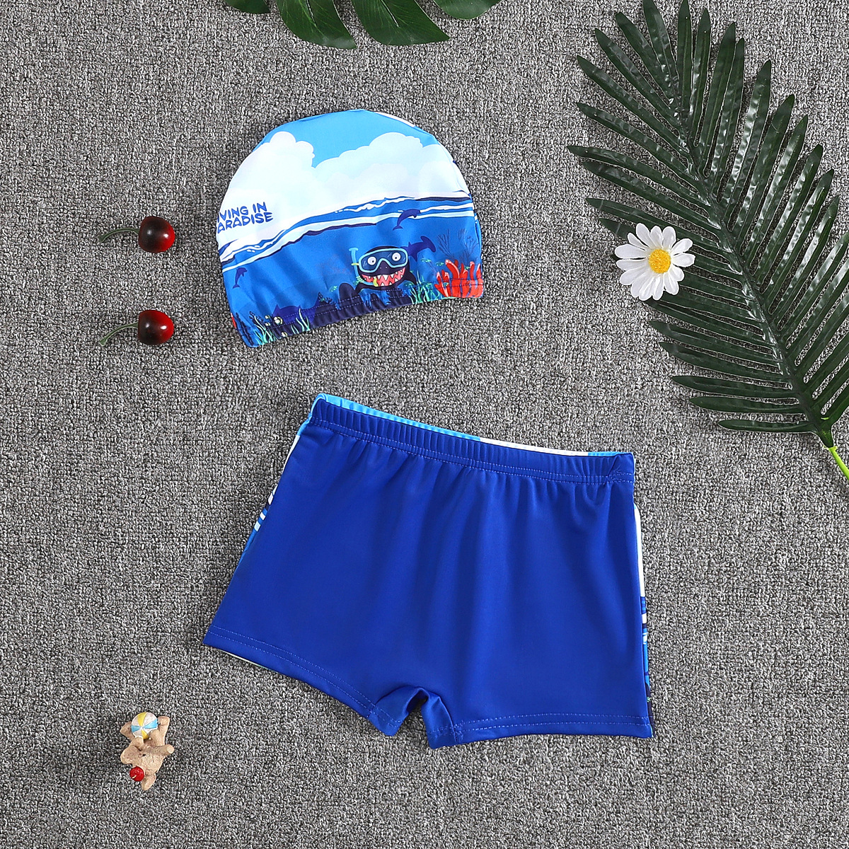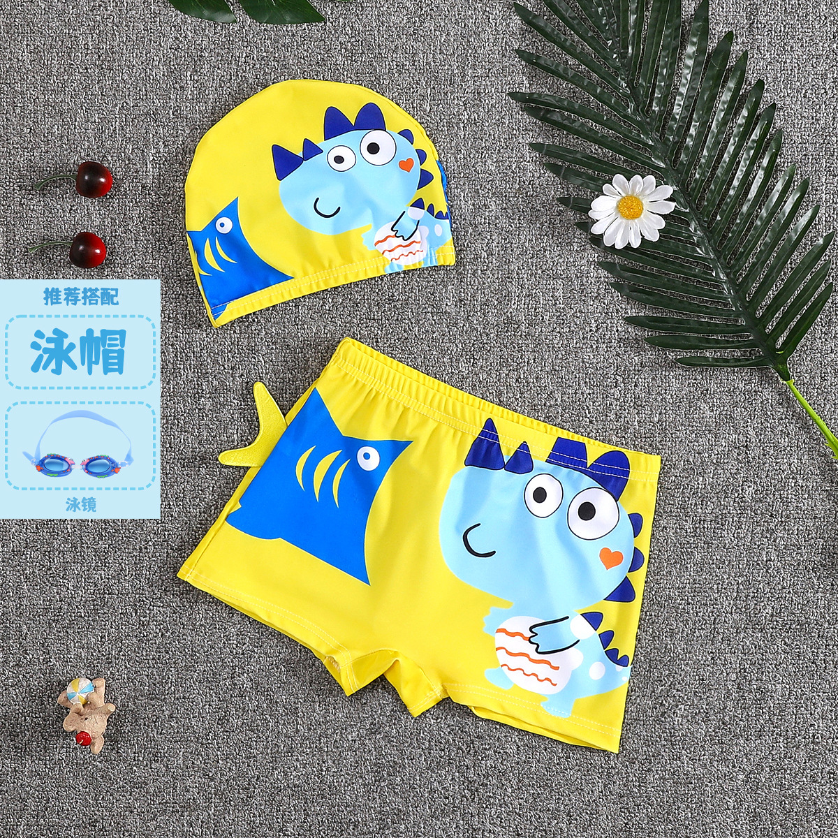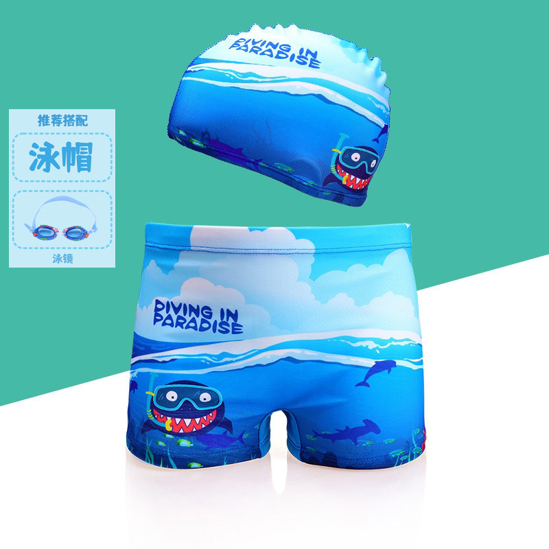 어린이 수영 트렁크 소년 수영 세트 만화 플랫 앵글 빠른 건조 어린이 아기 수영 모자 세트 중소 어린이 소년 온천