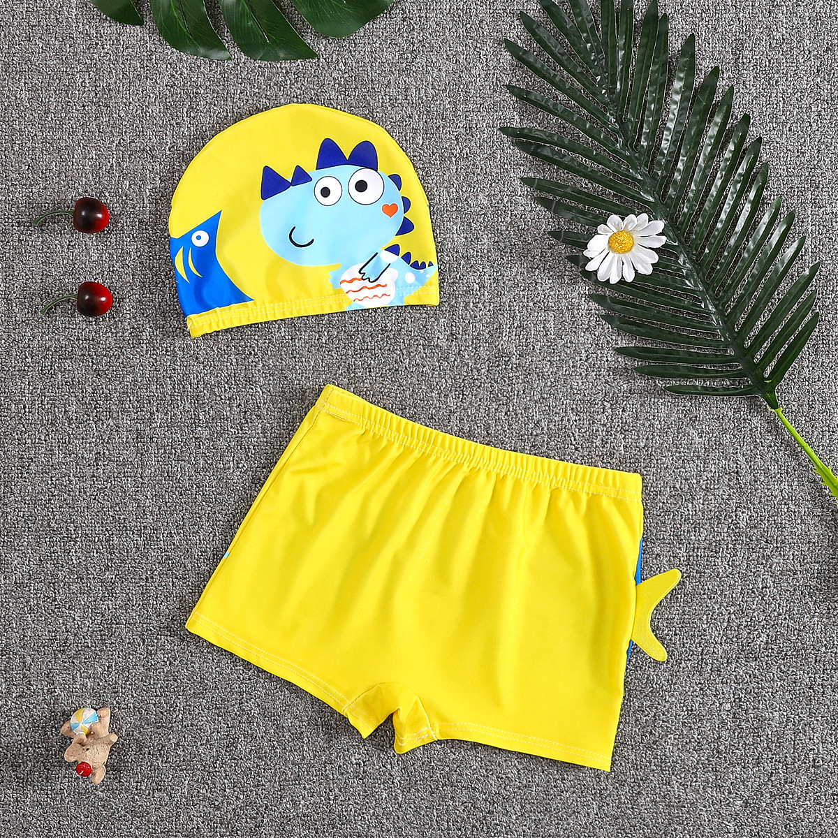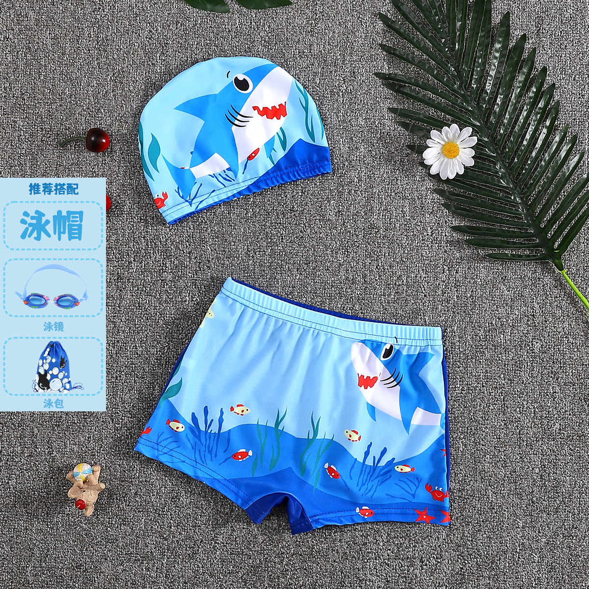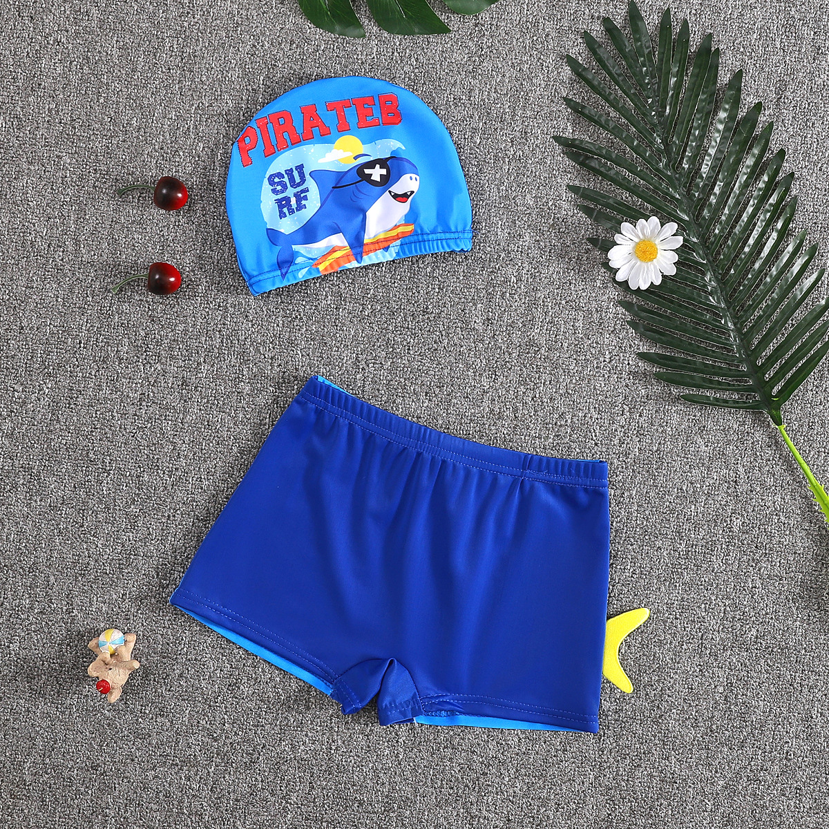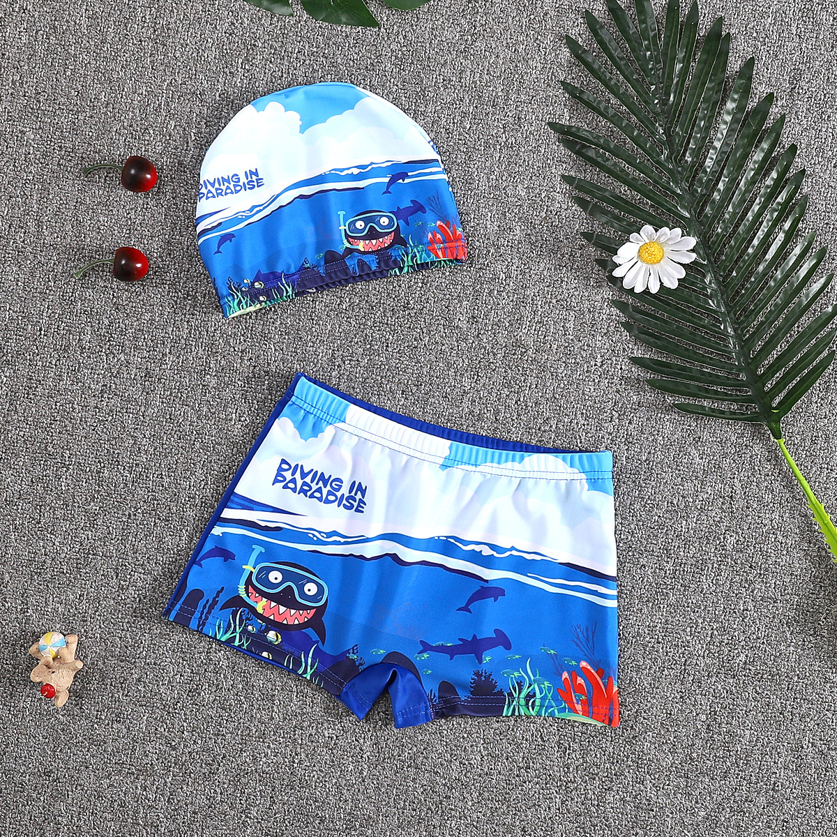 어린이 수영 트렁크 소년 수영 세트 만화 플랫 앵글 빠른 건조 어린이 아기 수영 모자 세트 중소 어린이 소년 온천