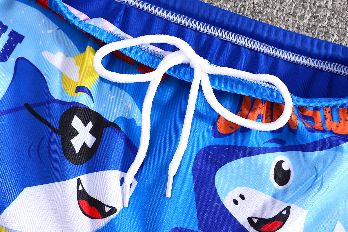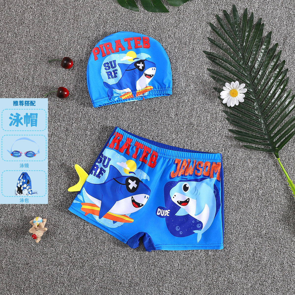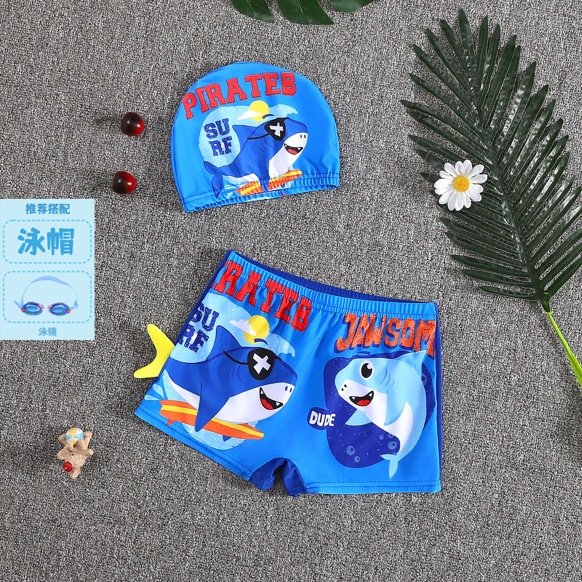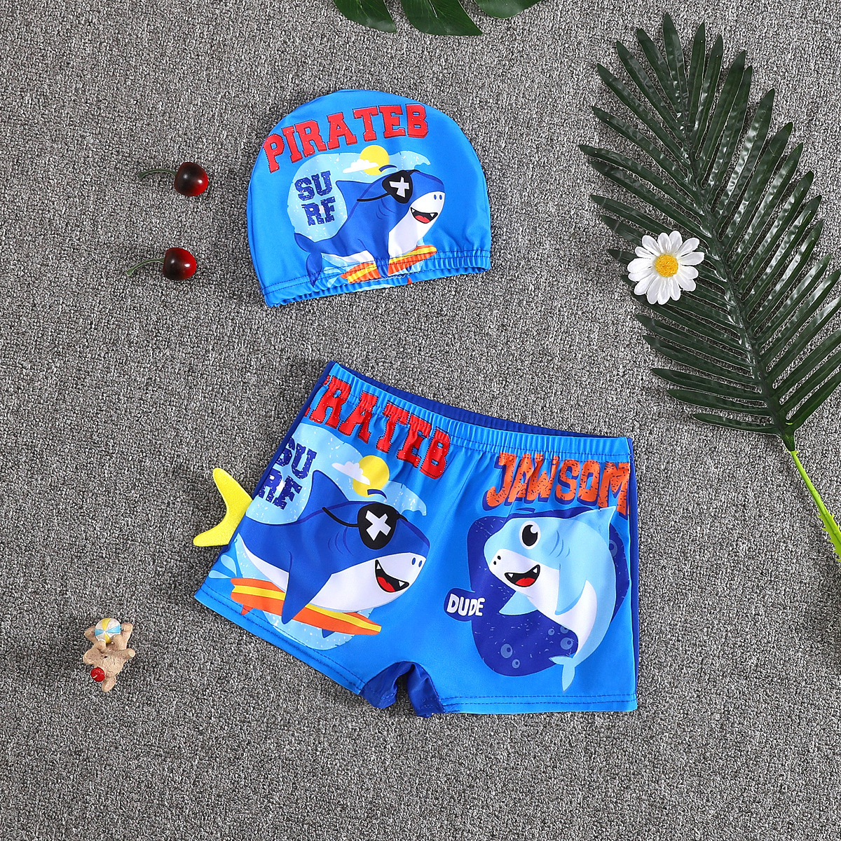 어린이 수영 트렁크 소년 수영 세트 만화 플랫 앵글 빠른 건조 어린이 아기 수영 모자 세트 중소 어린이 소년 온천