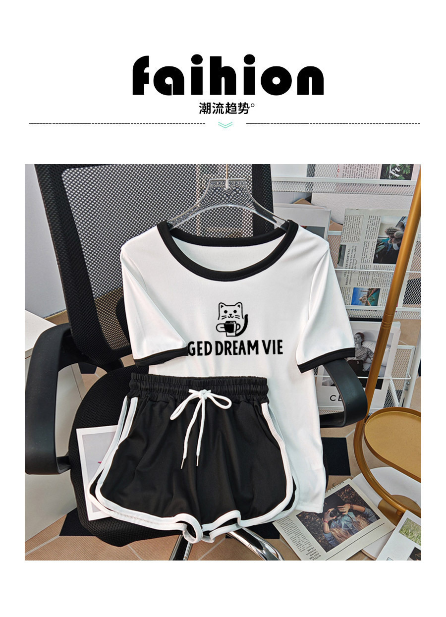 스티치 대비 색 칼라 슬림 아이스 실크 반팔 티셔츠 봄 여름 가을 새로운 정장 여성 캐주얼 스포츠 반바지스토어 가기