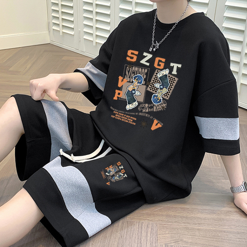 남성용 플러스 사이즈 여름 캐주얼 슈트, 와플 반팔 티셔츠, 청소년 및 학생용 루즈한 스포츠 5부 바지, Ligao