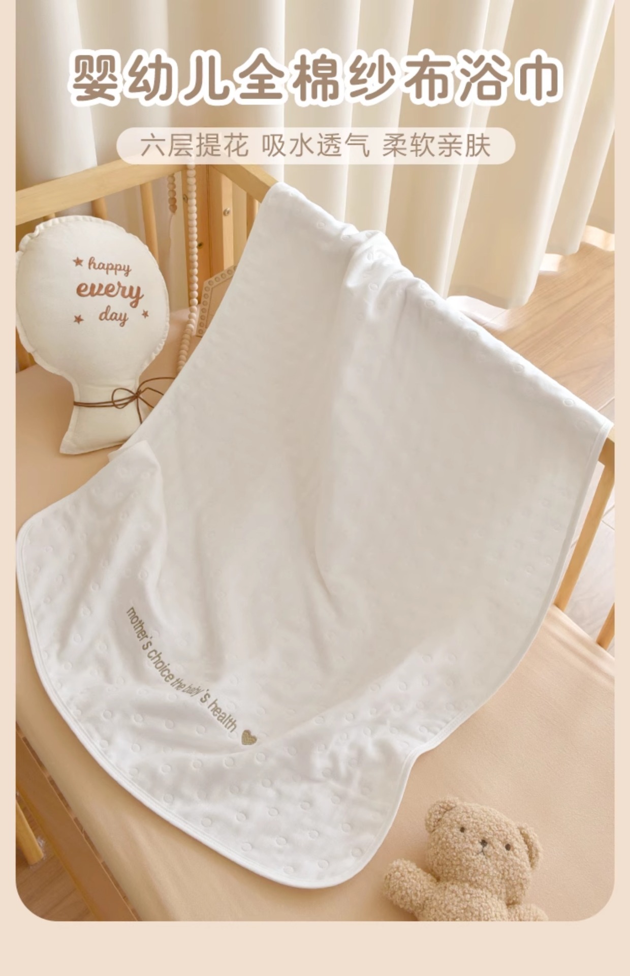 这款浴巾采用的是六层全棉纱布,吸水性强