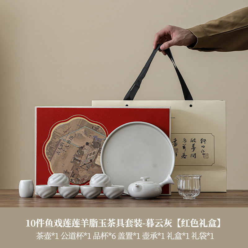 • 물고기 연꽃 연꽃 양고기 지방 옥 차 세트 10개 - 무윤 그레이(빨간색 선물 상자)