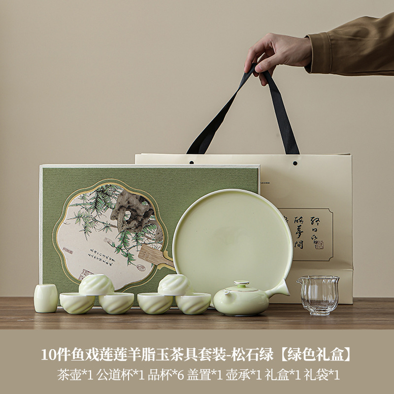 • 10피스 물고기 연꽃 연꽃 양고기 지방 옥 차 세트-옥 흰색(녹색 선물 상자)