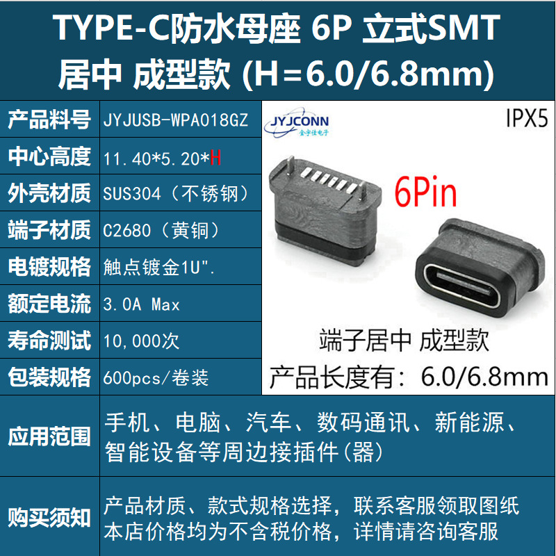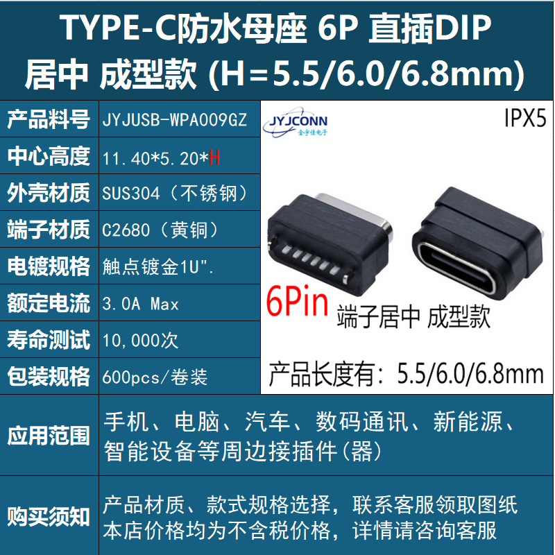 • 방수 Type-C 암 커넥터 6핀 수직 실장형, 중앙 정렬 몰딩