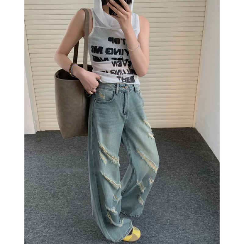 한국 스타일 디자인 센스 공예 세련된 워시 리핑 청바지 여성의 2025 새로운 슬림 와이드 레그 스트레이트 바지