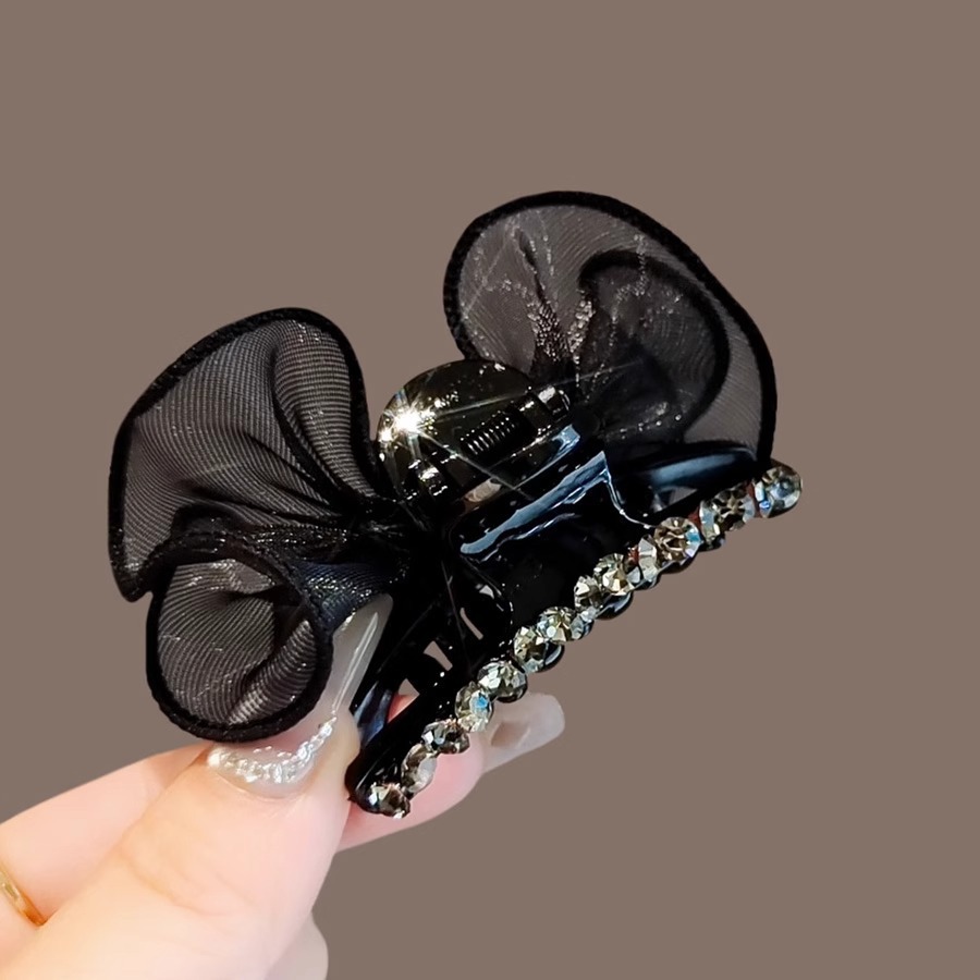 高级感缎面大号黑色蝴蝶结鲨鱼夹头饰方形钻后脑勺发夹抓夹女发卡