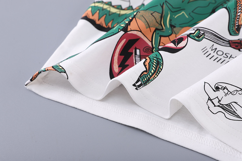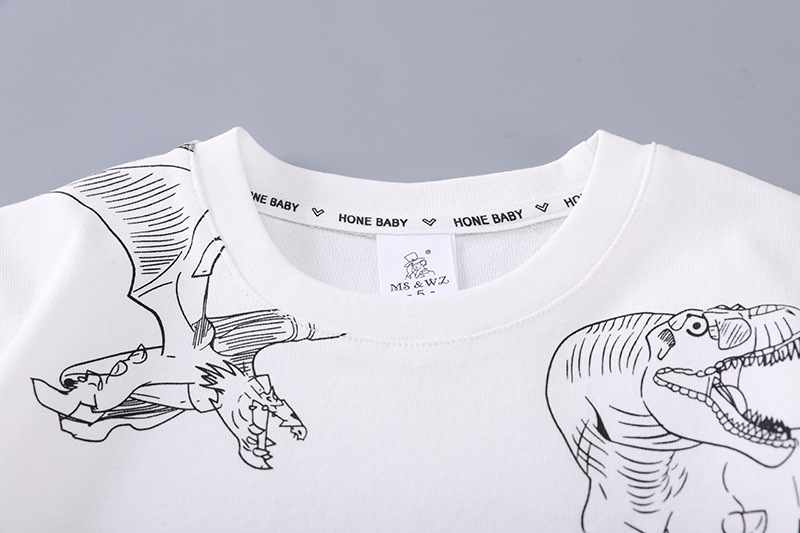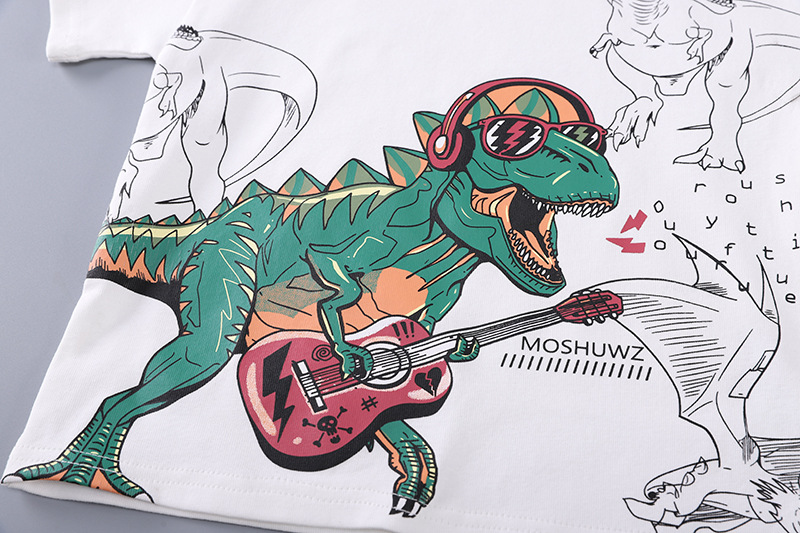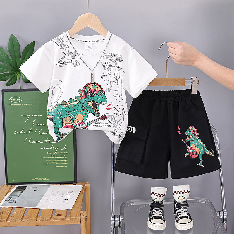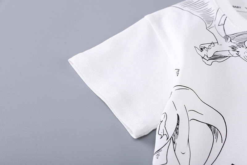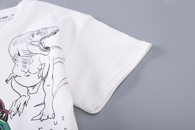 • 흰색 공룡 크루 넥 셔츠와 워싱 코튼 팬츠 반팔 슈트