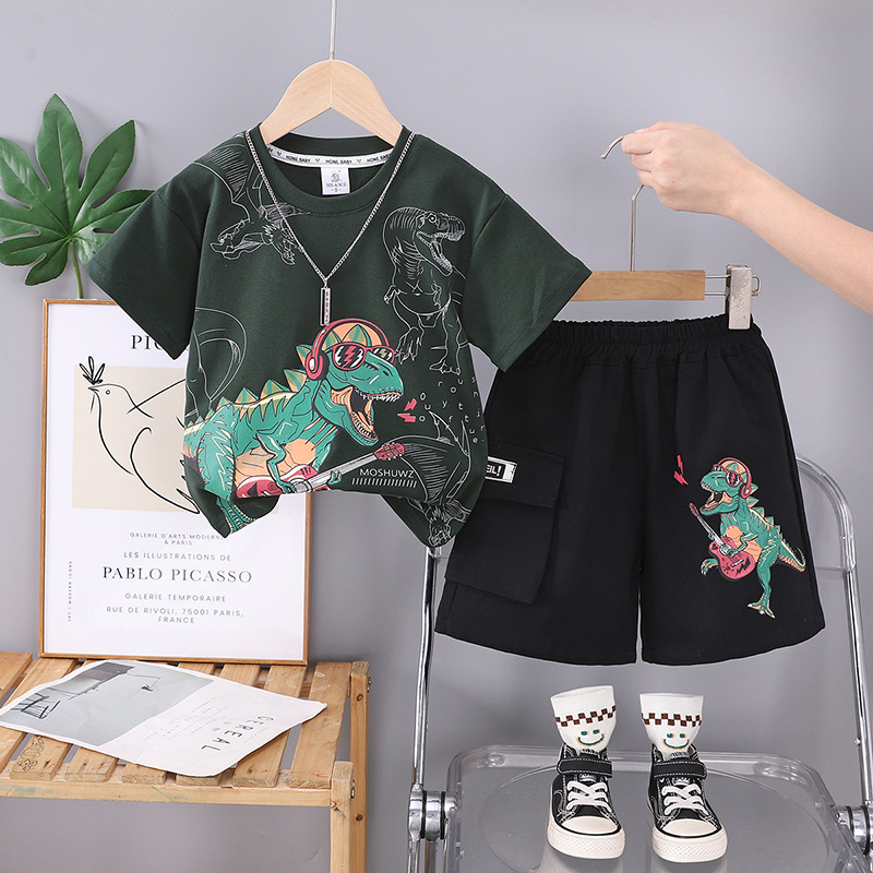 • 짙은 녹색 공룡 크루 넥 셔츠와 워시드 코튼 팬츠 반팔 슈트
