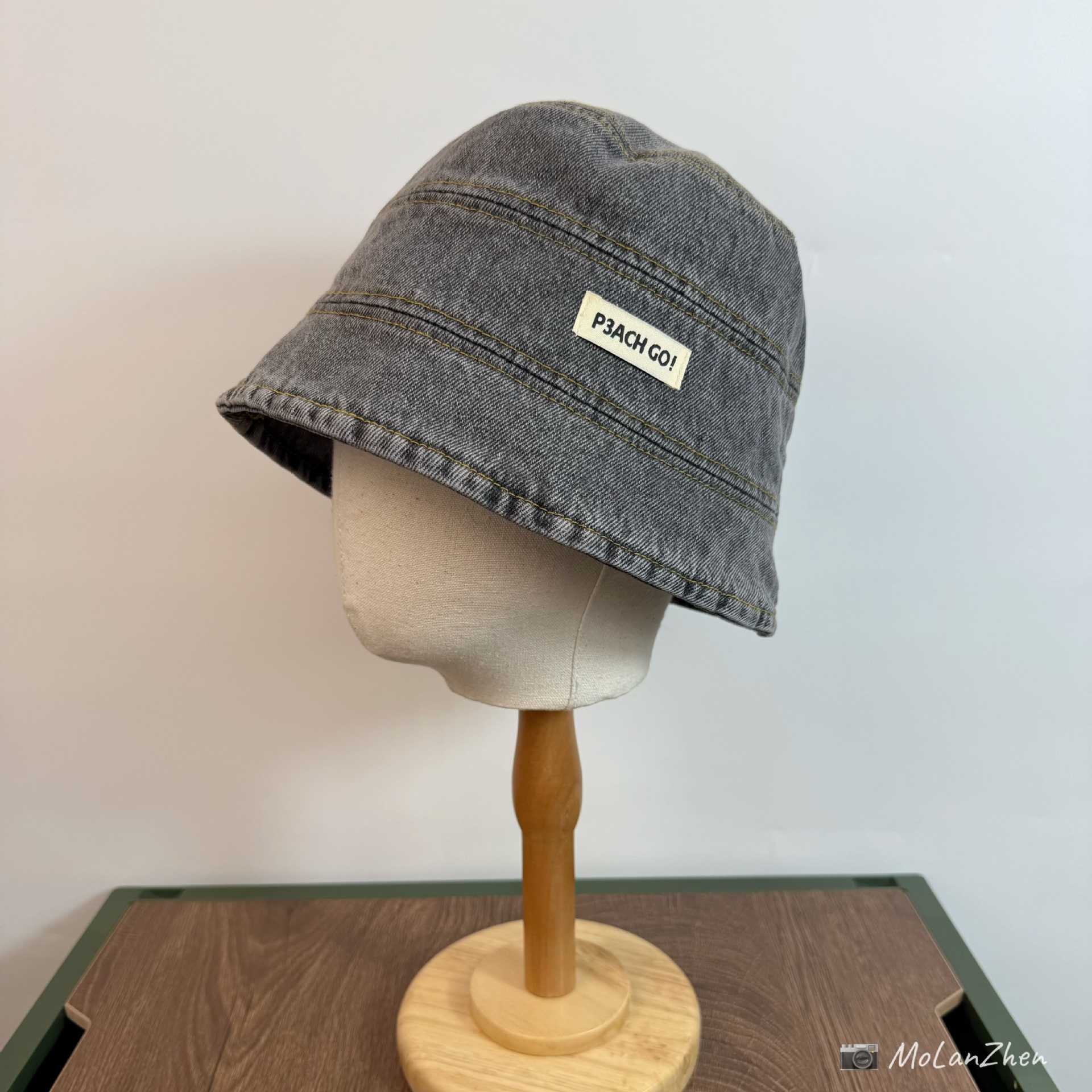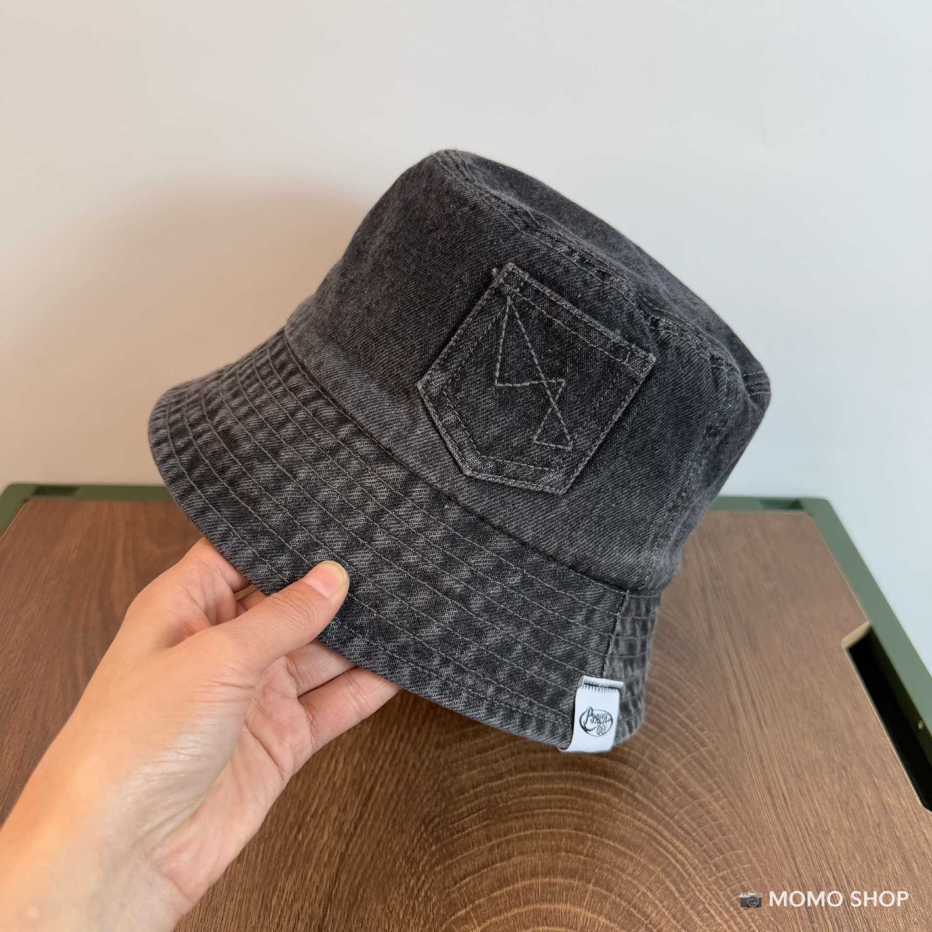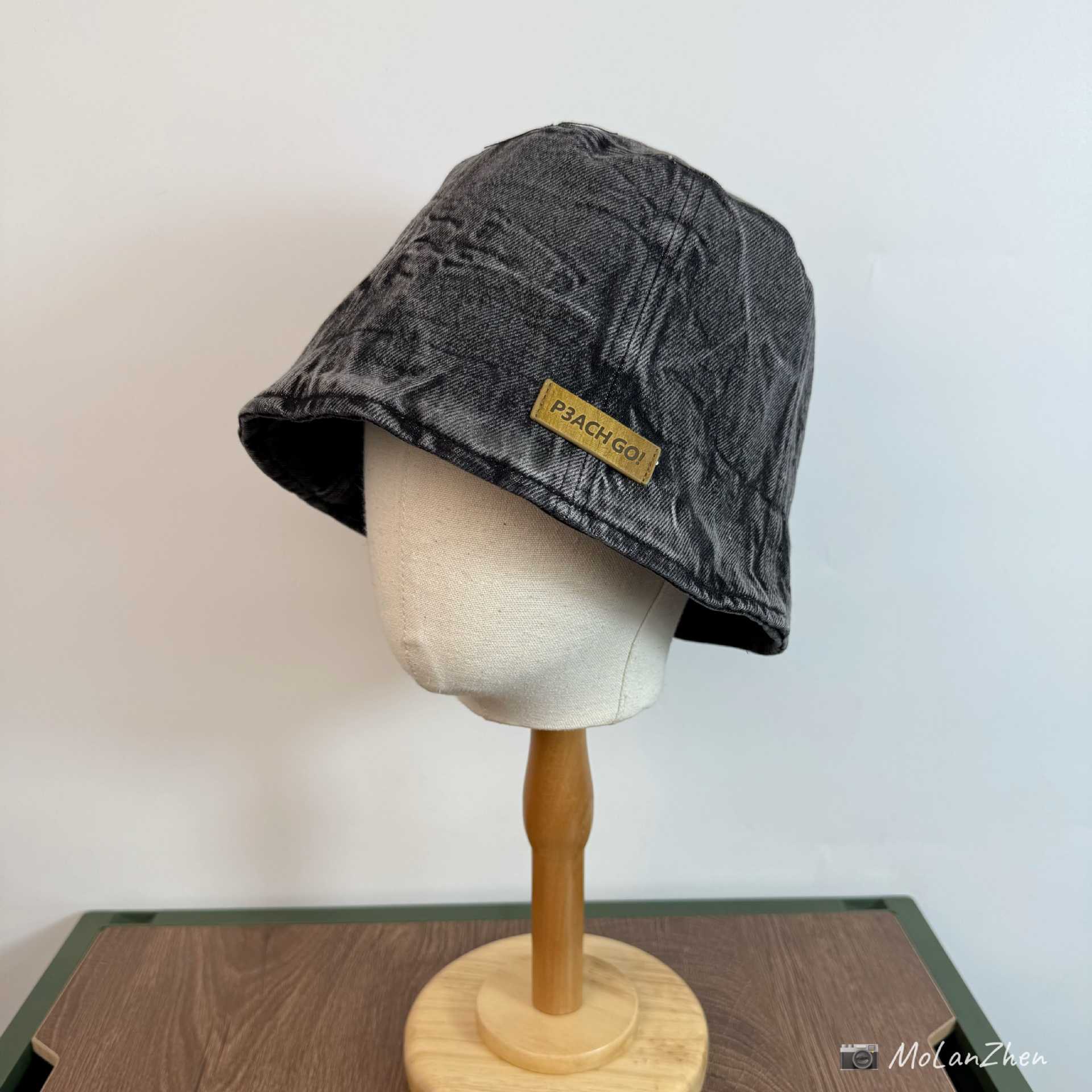 • 블랙 데님 (P3ACH GO!앞면이 길고 뒷면이 짧은 천 라벨이 있는 어부 모자)