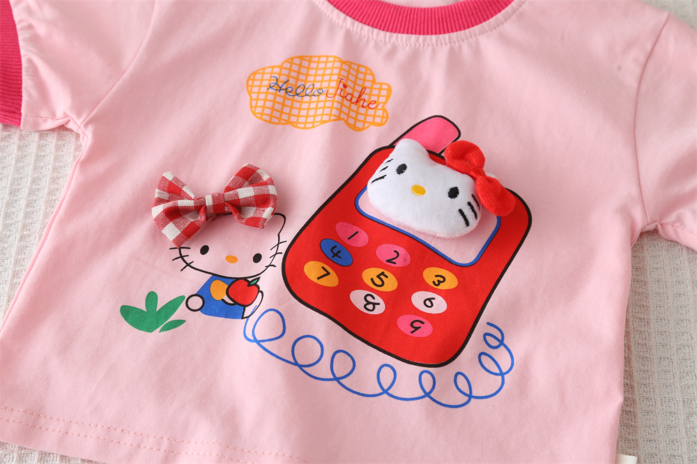 2025 년 여름 새 소녀 인쇄 고양이 크루 넥 반팔 세트 투피스 캐주얼 반바지