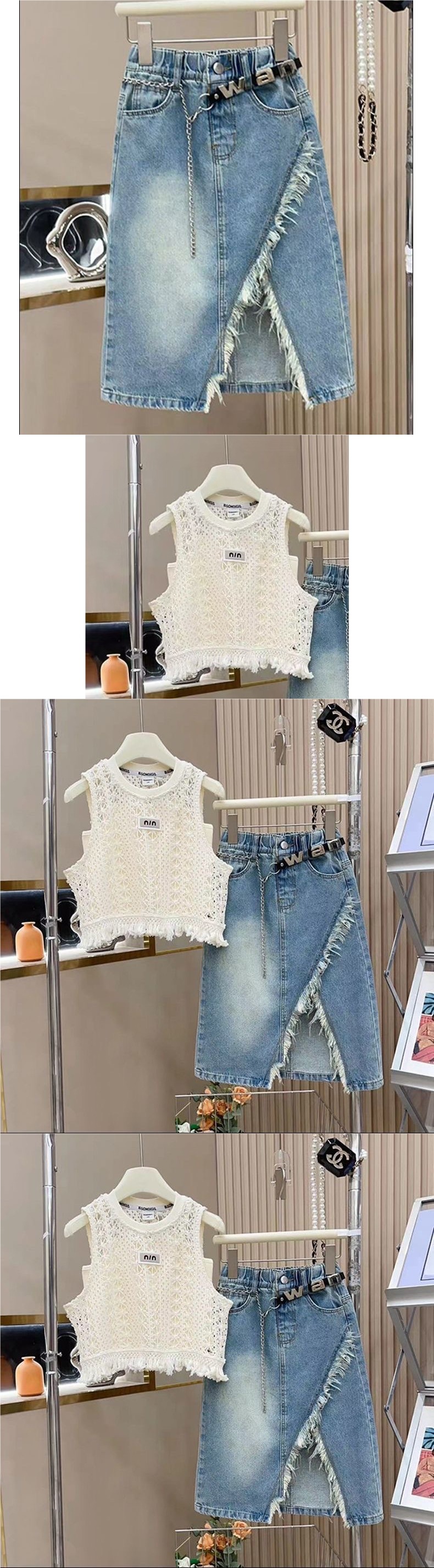 • 내구성이 뛰어난 속이 빈 민소매 조끼 + 데님 스커트 트렌드