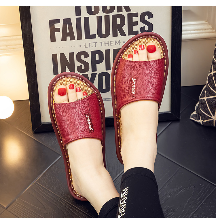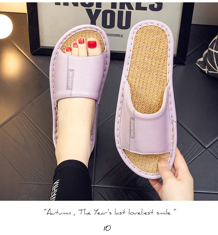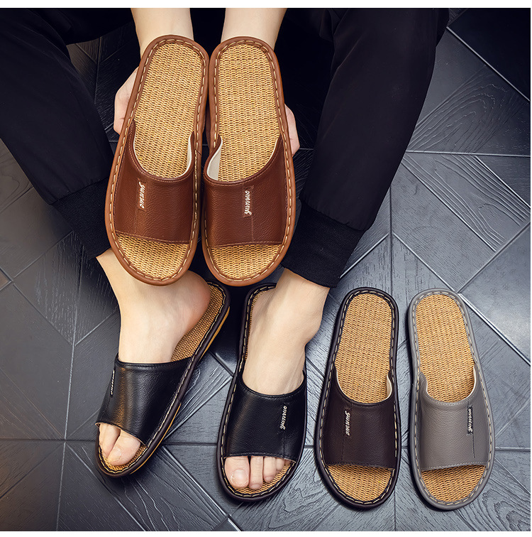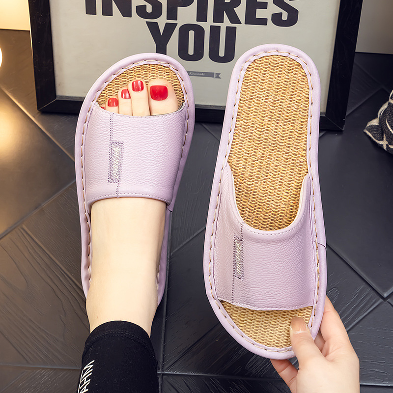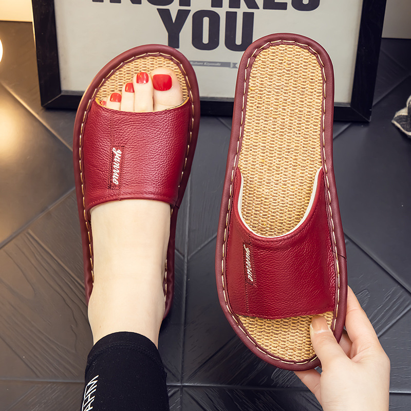 가정용 실내용 여름 통기성 가죽 린넨 슬리퍼 여성용 미끄럼 방지 두꺼운 밑창 소가죽 슬리퍼 커플 남성용