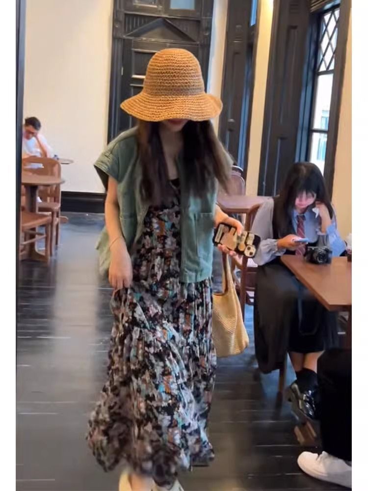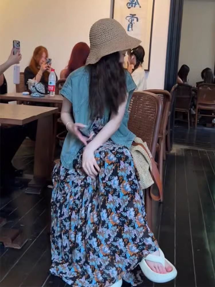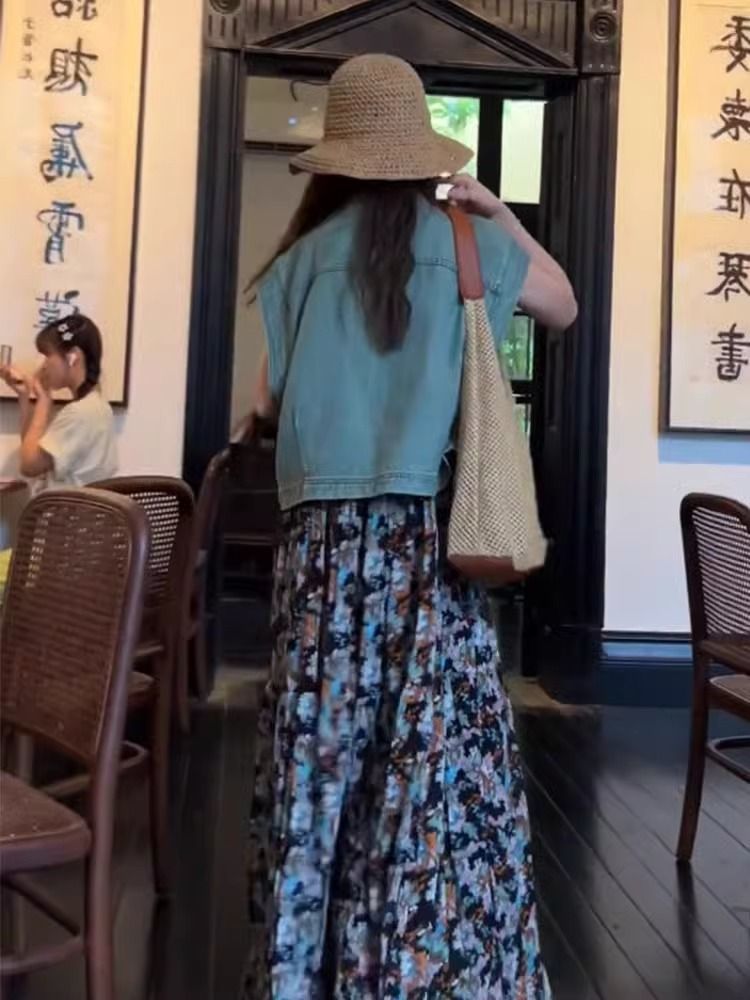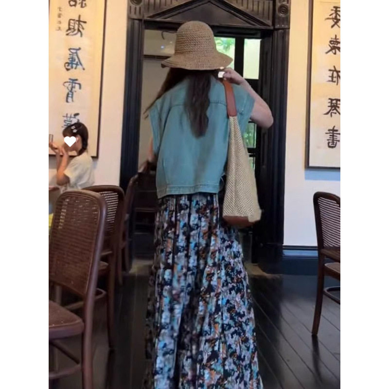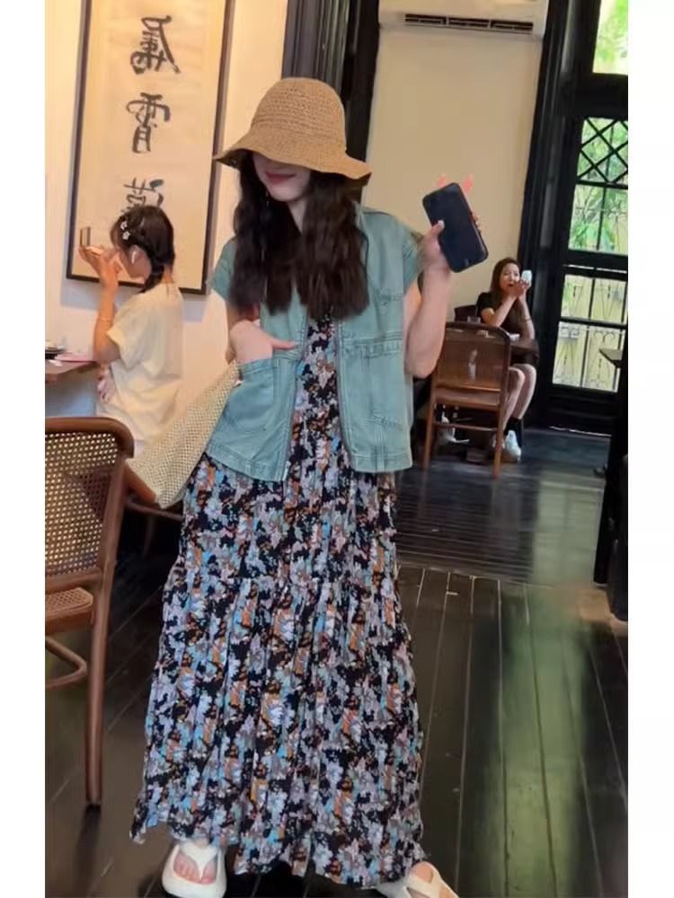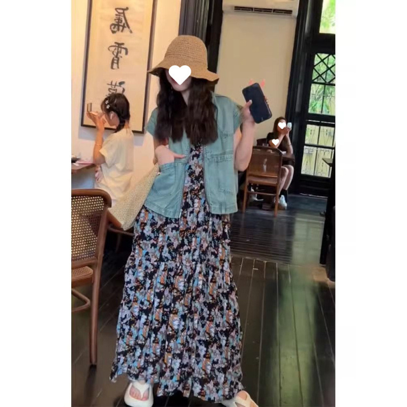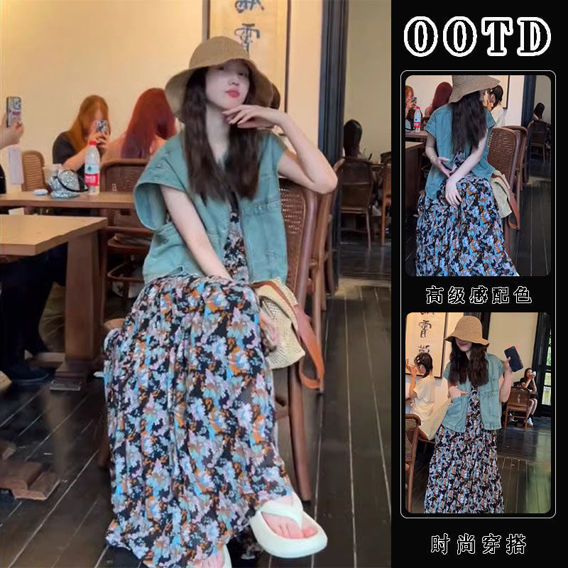 캐주얼 패션의 세트와 함께 여름 원피스 활기찬 나이 감소 블루 데님 코트 꽃 슬링 원피스 세트스토어 가기
