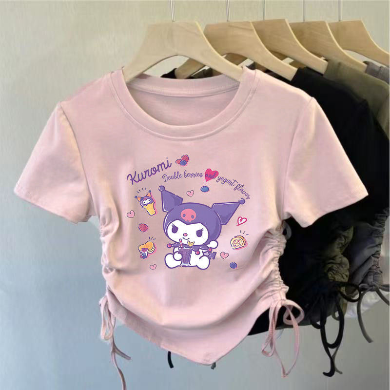 Jade Dog Girls Drawstring 반팔 티셔츠 Xia Kuromi 큰 어린이 짧은 셔츠 여성용 얼음 실크 스레드 반팔 탑
