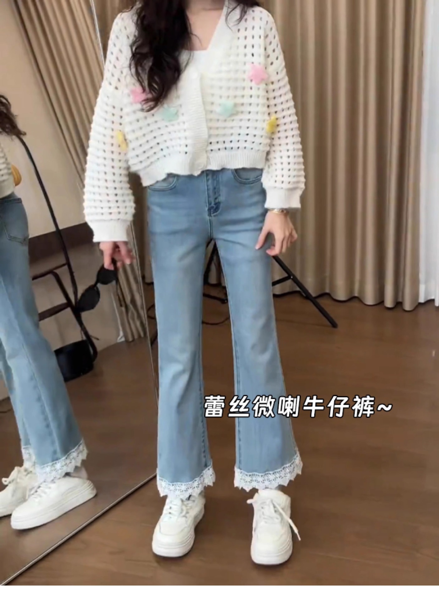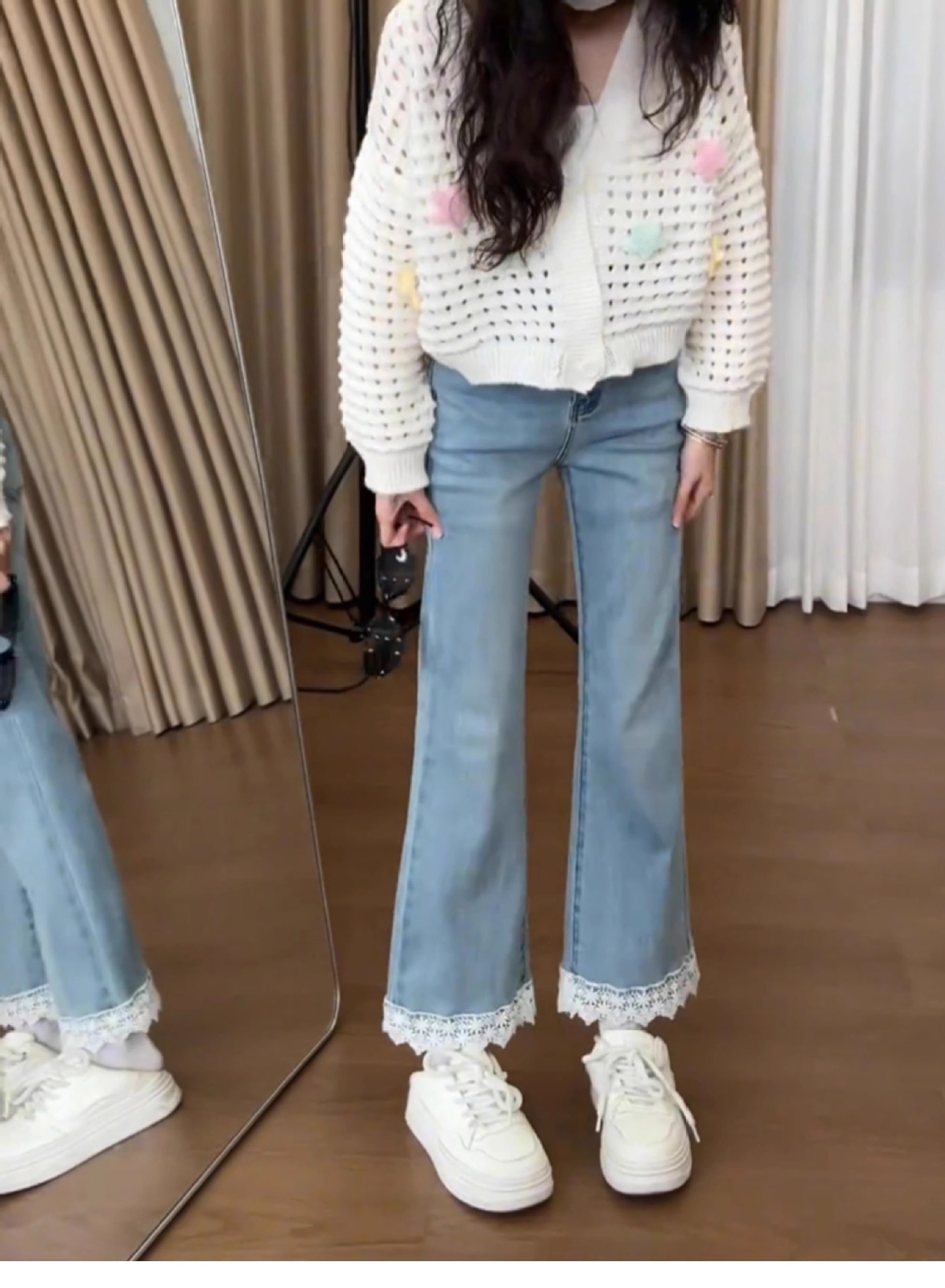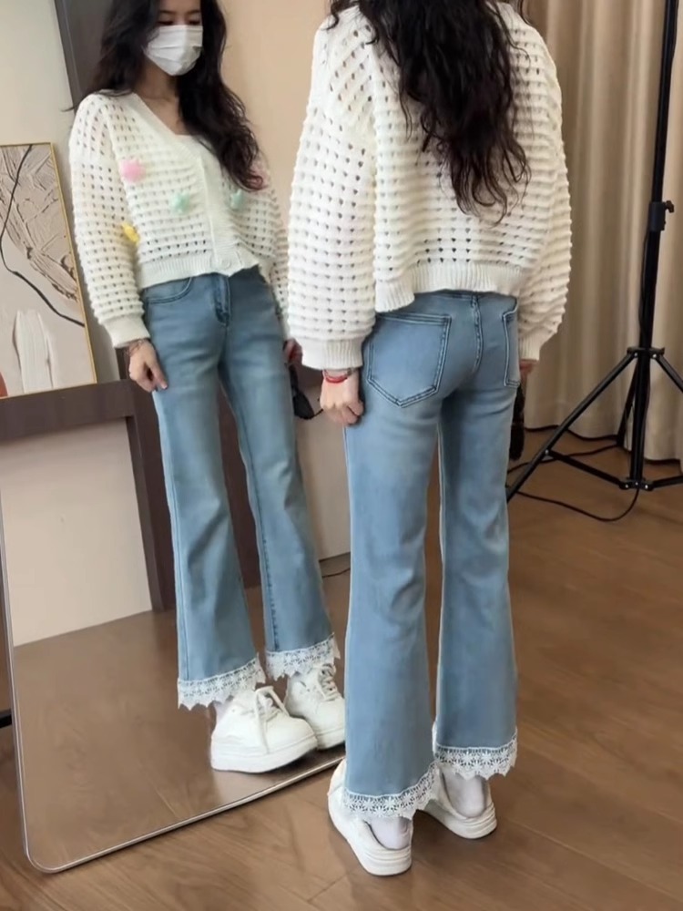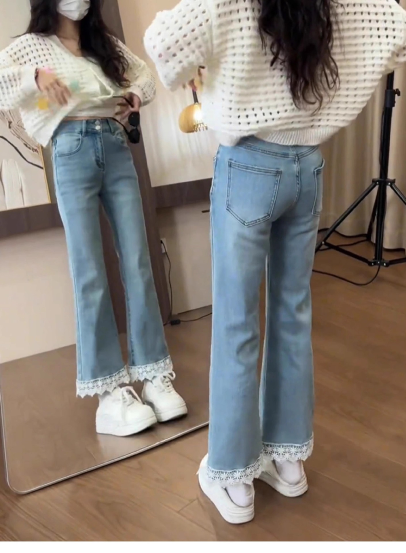 블루 레이스 트림 마이크로 램 청바지 여성의 봄과 여름 2025 새로운 배 모양의 바디 플러스 사이즈 슬리밍 자른 플래 바지스토어 가기