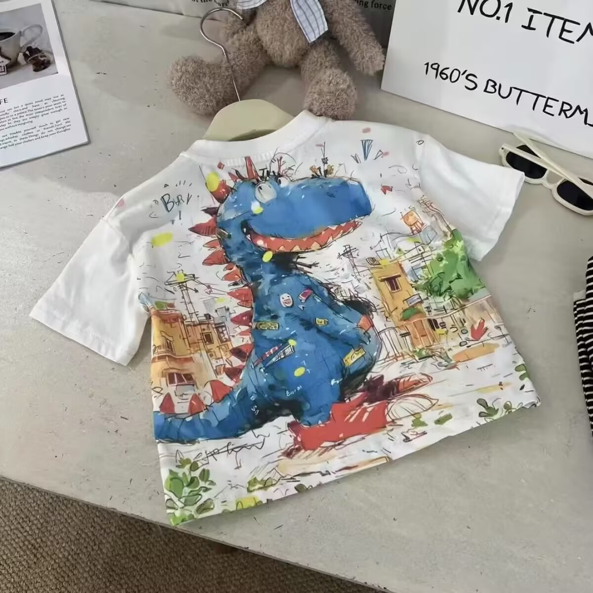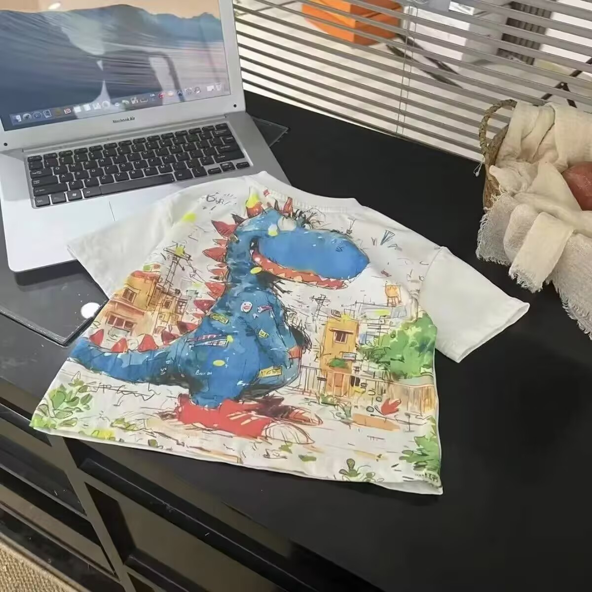 소년 반팔 티셔츠 2025 여름 새로운 어린이 맞춤형 퓨어 코튼 디지털 인쇄 통기성 공룡 탑