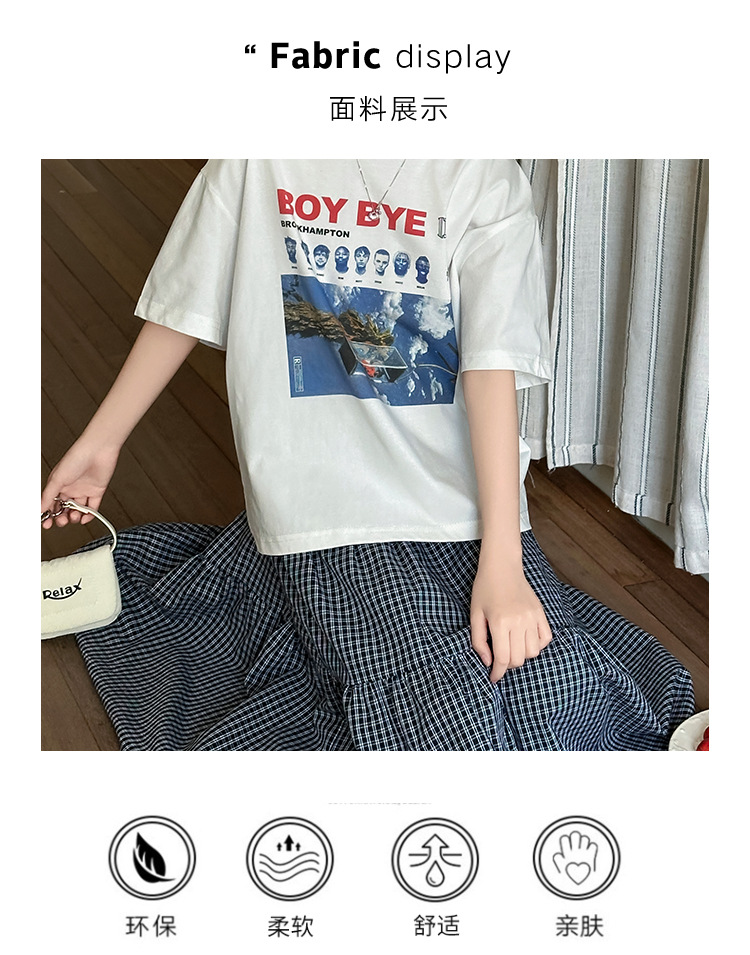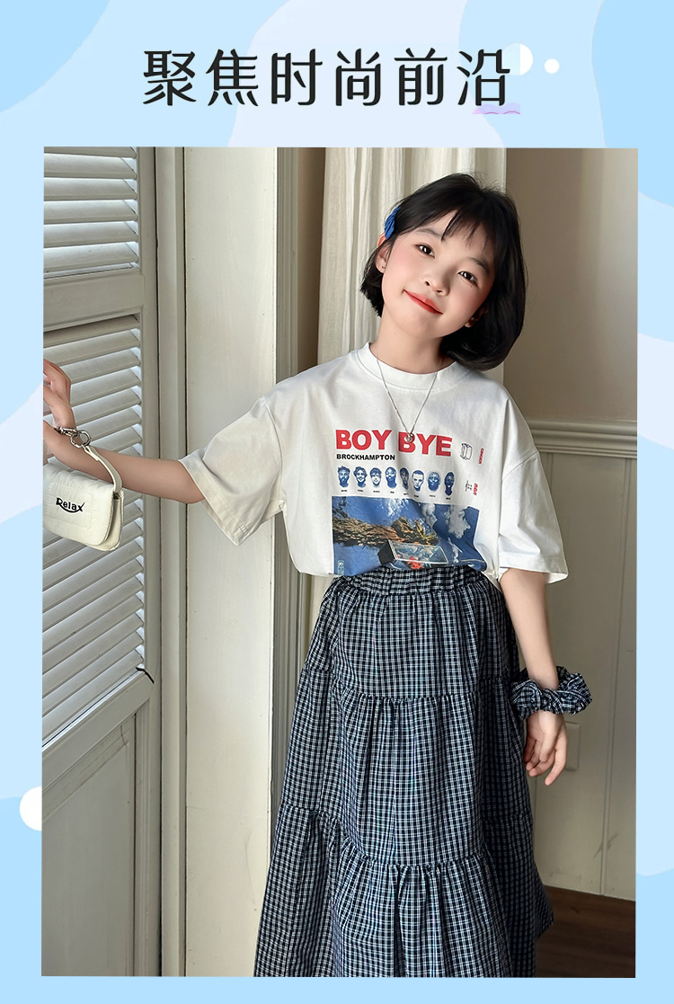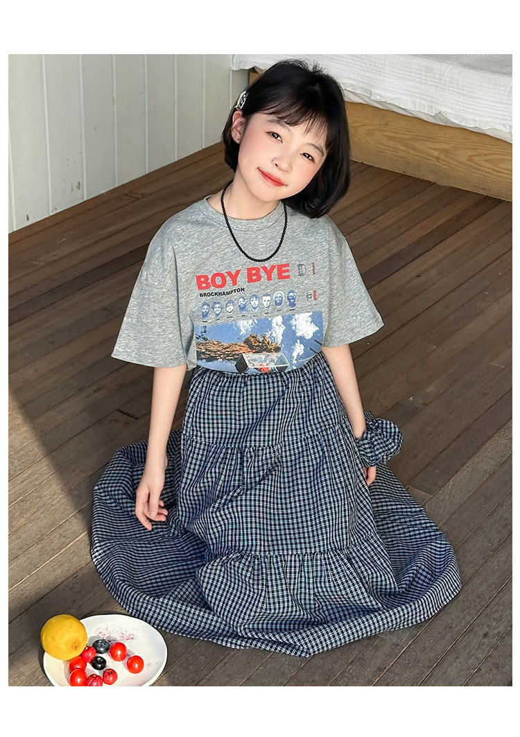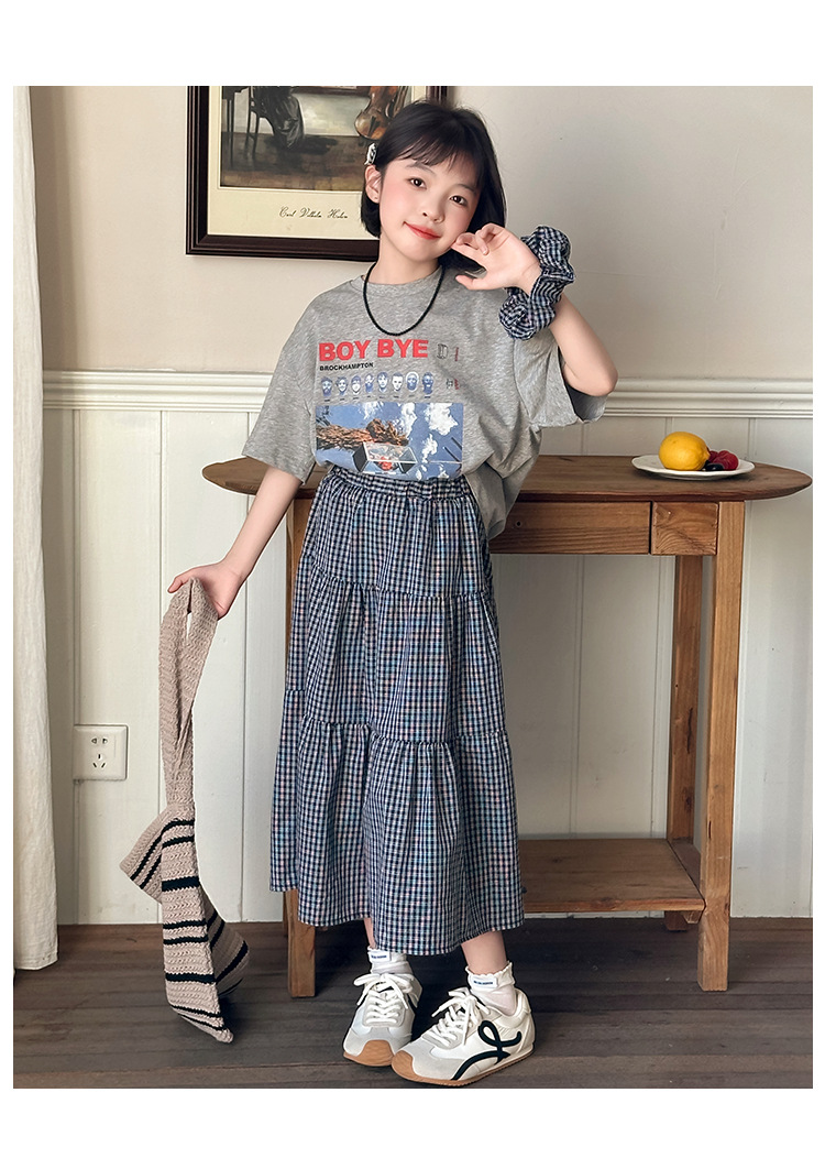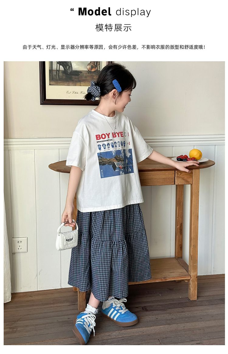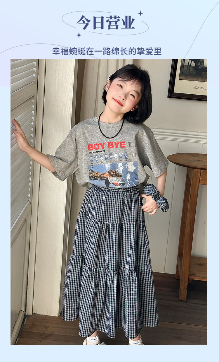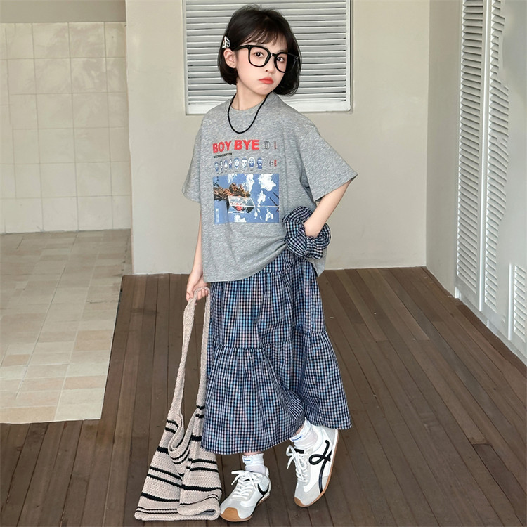 소녀 한국식 2025 여름 새로운 빈티지 편지 인쇄 반팔 티셔츠 중식 및 빅 세트 용 스커트스토어 가기