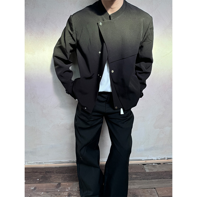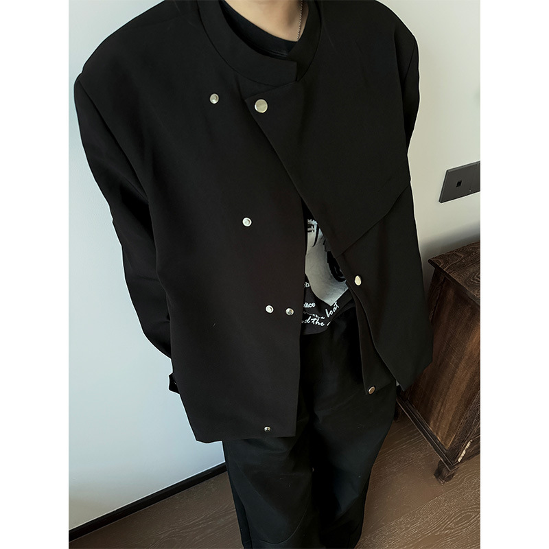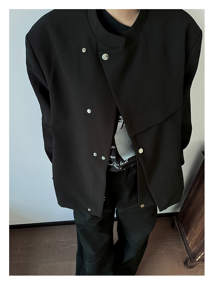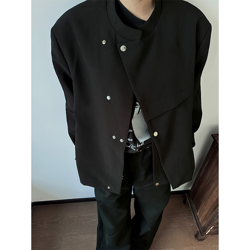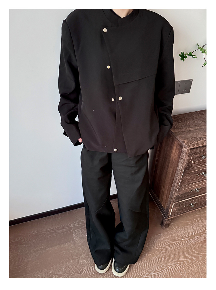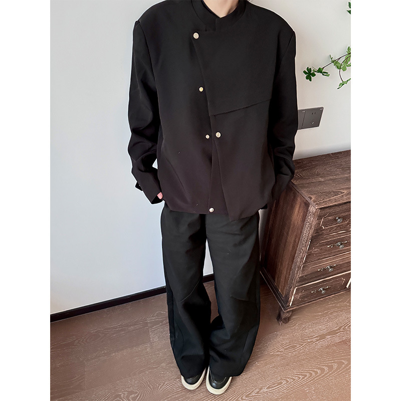 여름 해체 된 느슨한 잎 디자인 스냅 버튼 슬란 트 플래켓 비대칭 새로운 중국 스타일 칼라 주름 방지 어깨 패드 재킷 남성용 뉴
