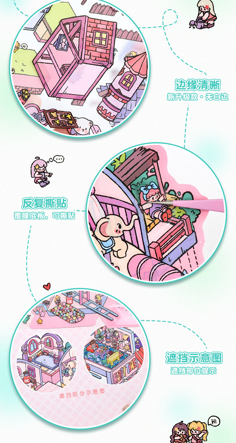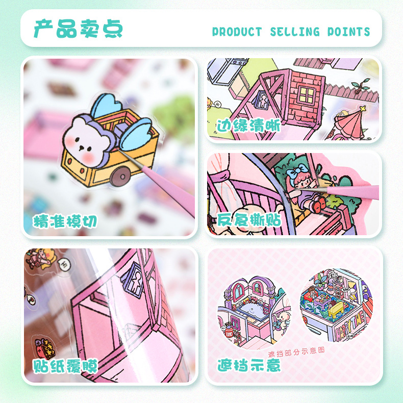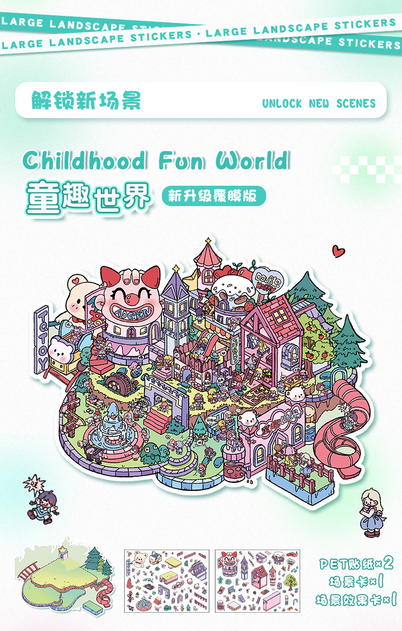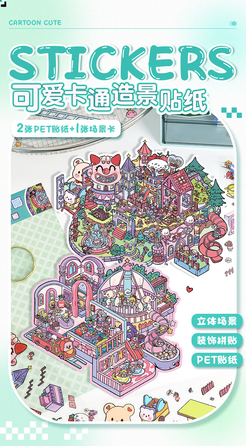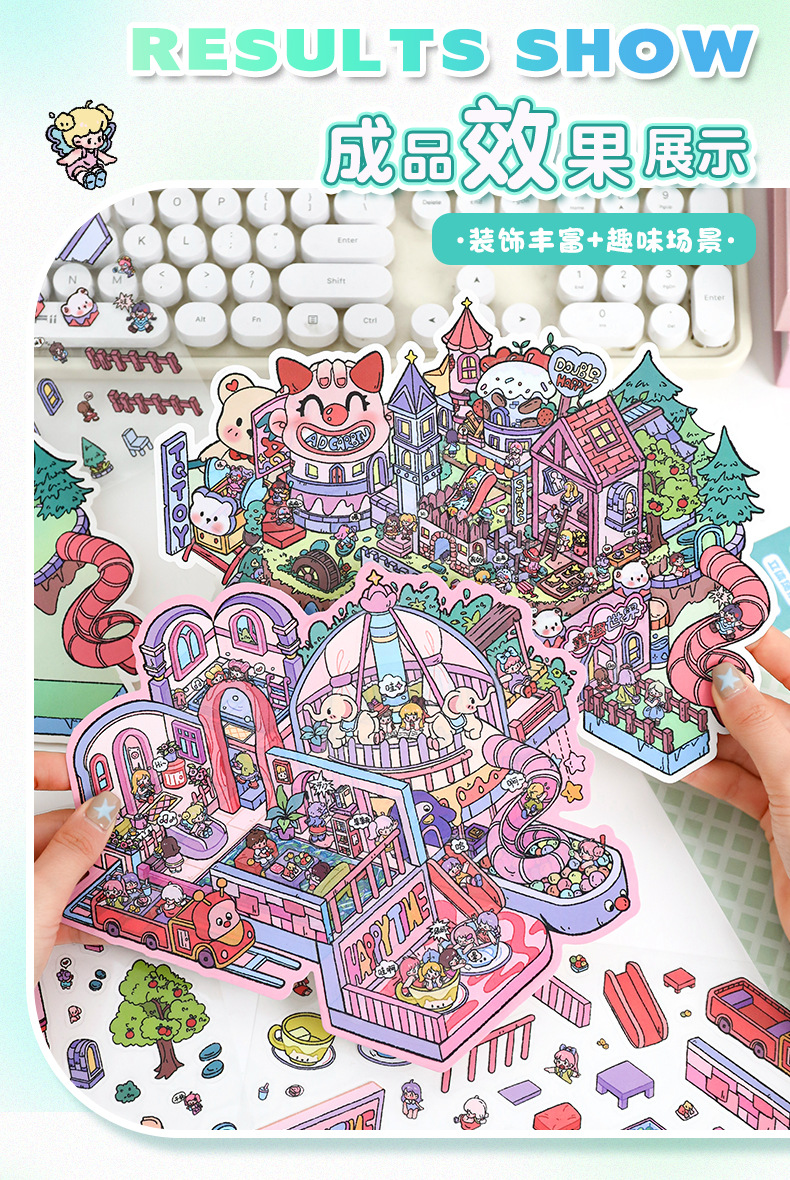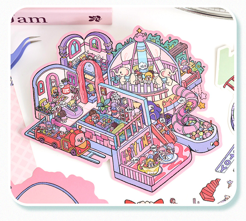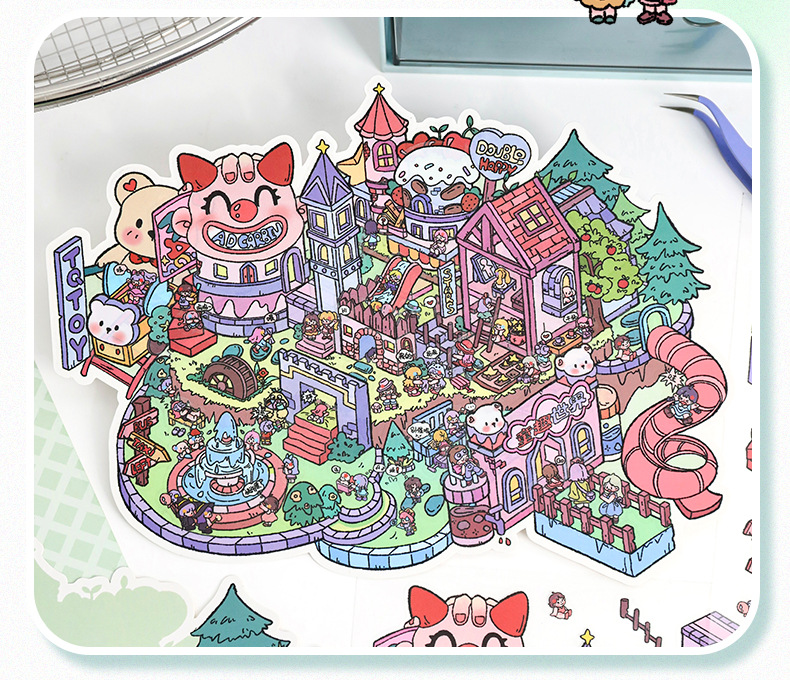 풍경 스티커 큰 만화 재미있는 세계 스티커 창조적 인 시각적 3d 입체 오두막 미니어처 장면 스티커 책