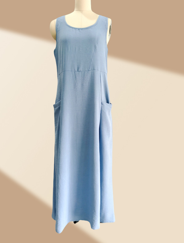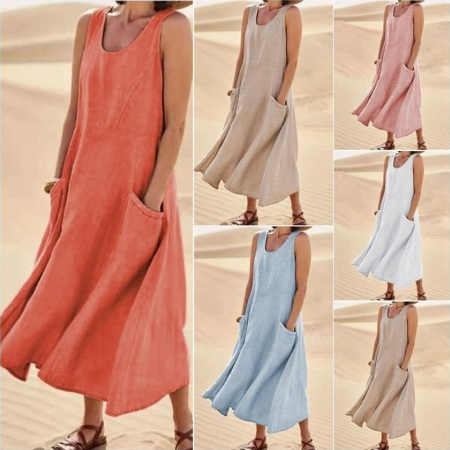 2025 Amazon Independent Station 여름 유럽과 미국의 대외 무역 포켓 민소매 크루 넥 여성면 및 리넨 원피스
