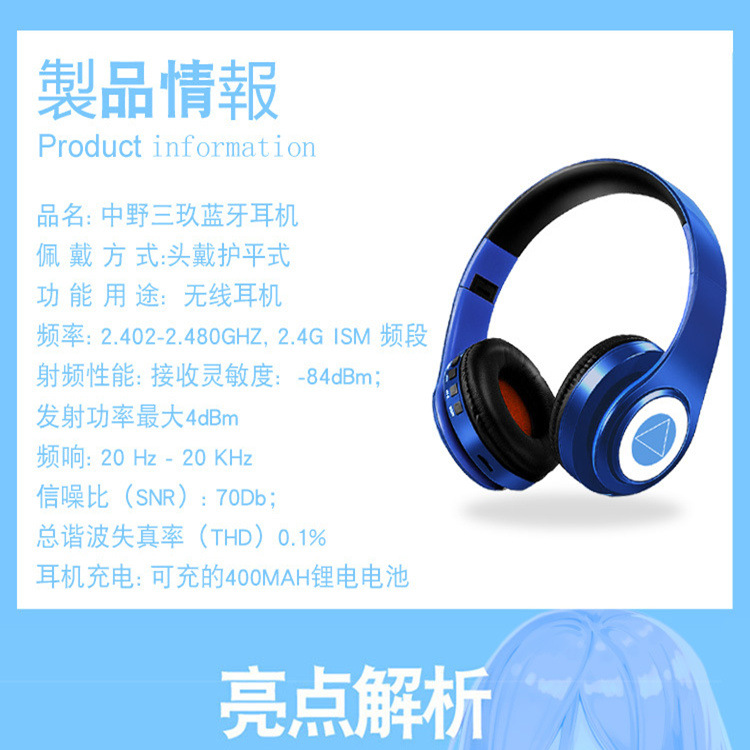 Sanjiu의 일본어 음성 애니메이션 신부 Nakano cos 2차원 블루투스 헤드셋 헤드 장착형 접이식 카드