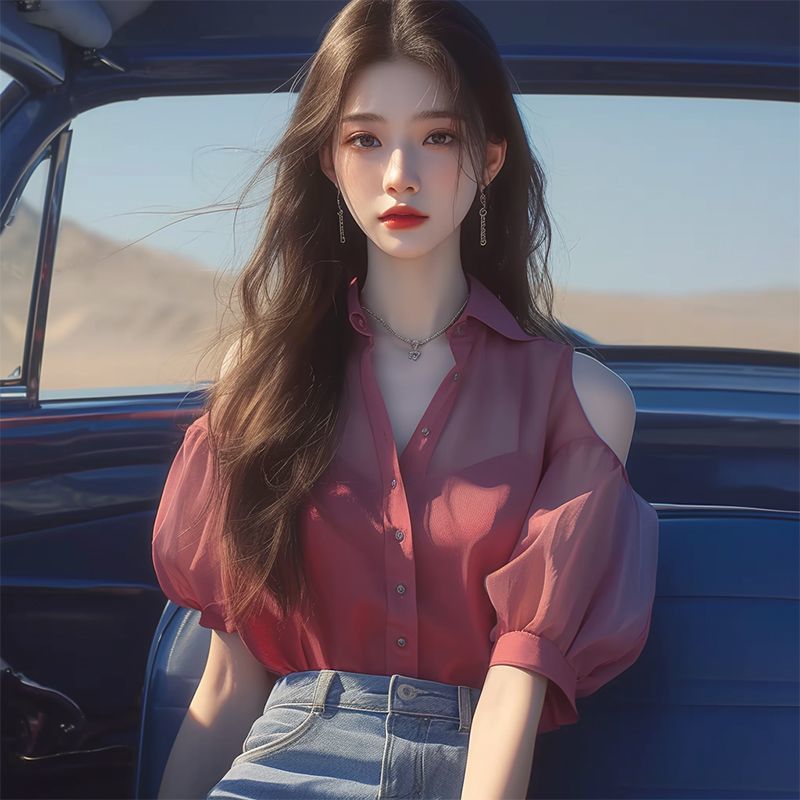 여름 틈새 프랑스 독특한 빛 성숙한 요정 최고 여성의 빛 럭셔리 하이 엔드 아름다운 빨간 어깨 쉬폰 셔츠