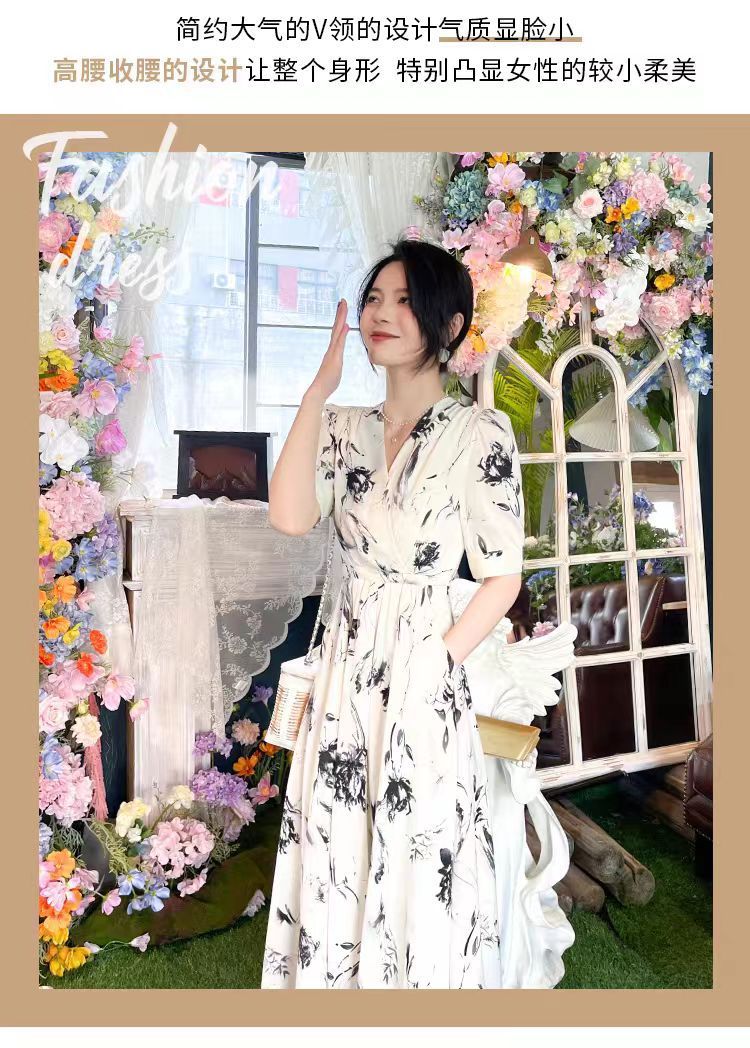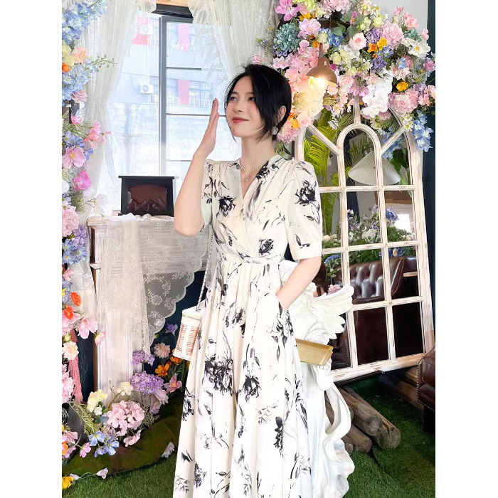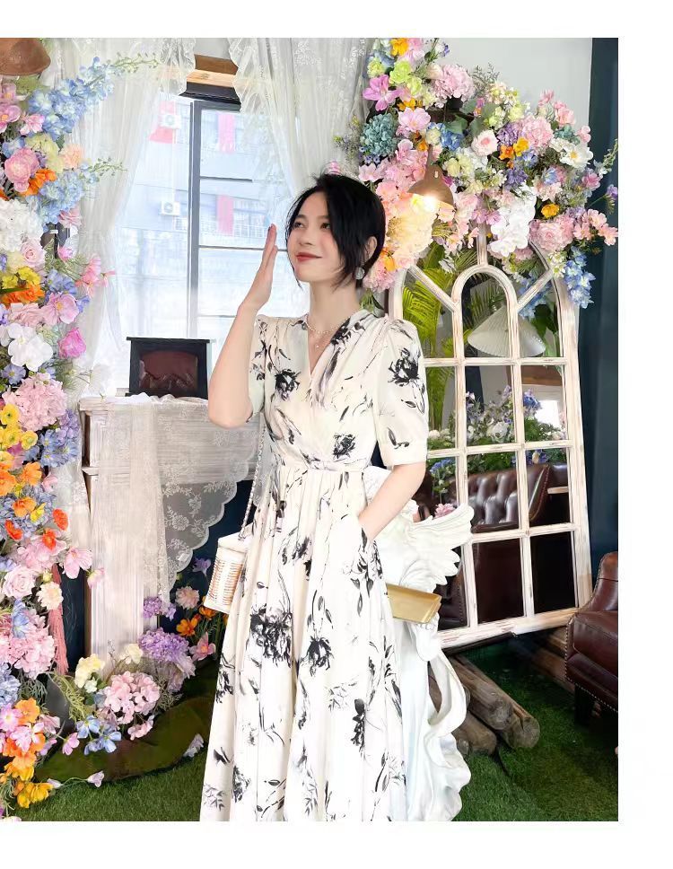 화이트 플로랄 원피스 여성 2025 여름 새 스타일 우아한 허리 하이 엔드 고급 프랑스 스타일 차 브레이크 짧은 원피스스토어 가기