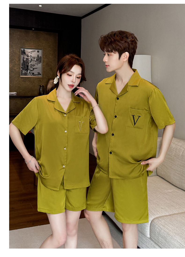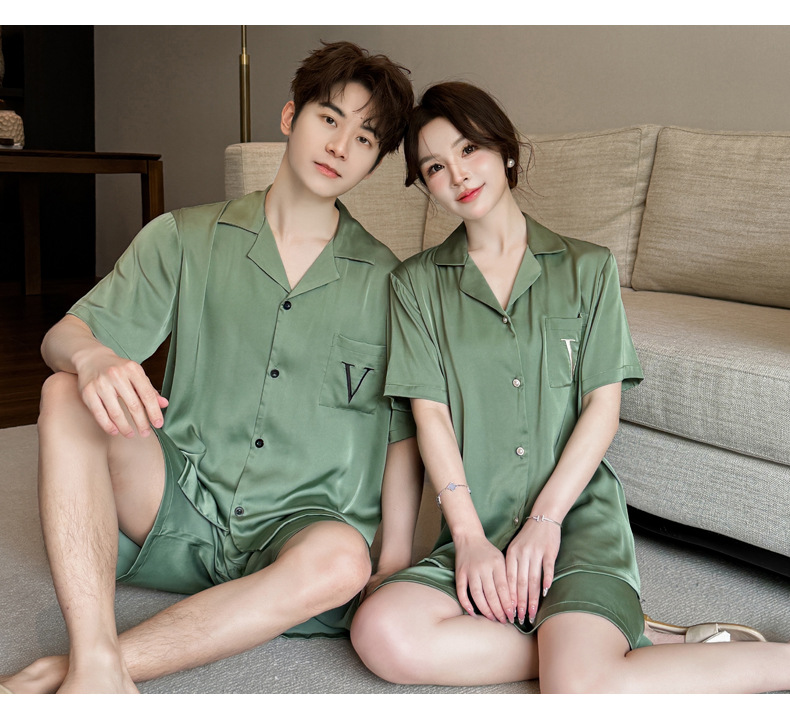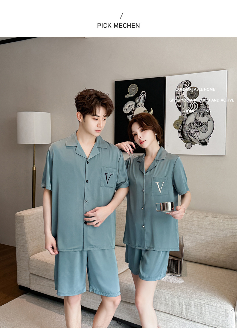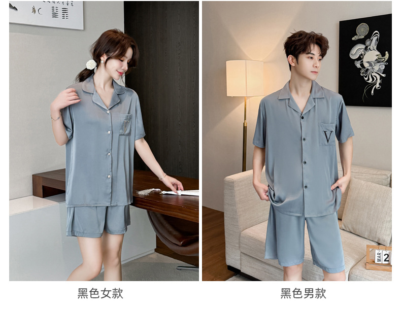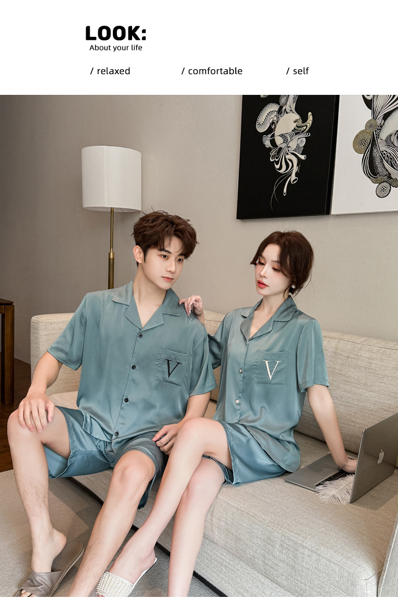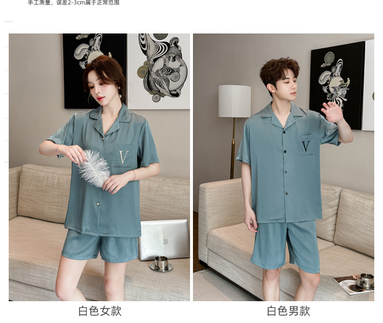 커플 잠옷 여성의 여름 아이스 실크 간단한 단색 짧은 소매 세트 2025 새로운 도착 잠옷 남자의 얇은 홈 옷스토어 가기