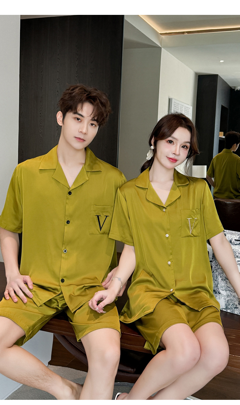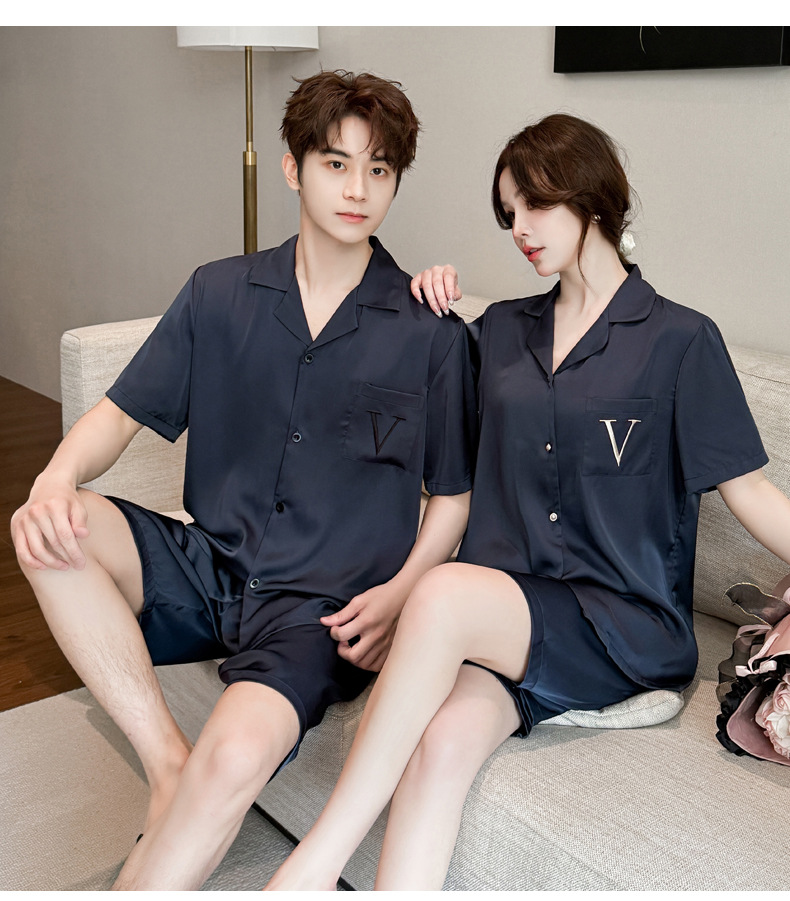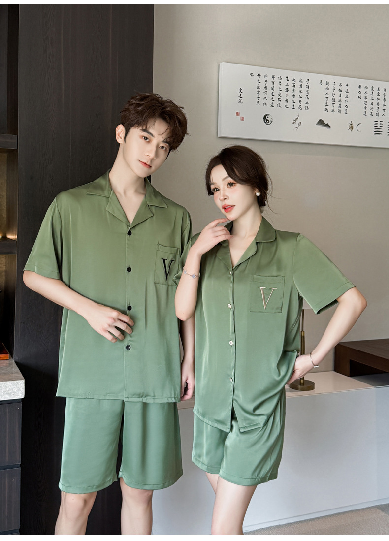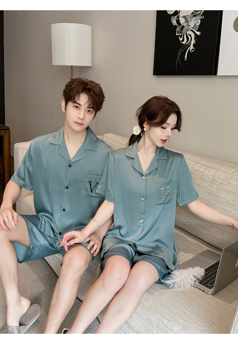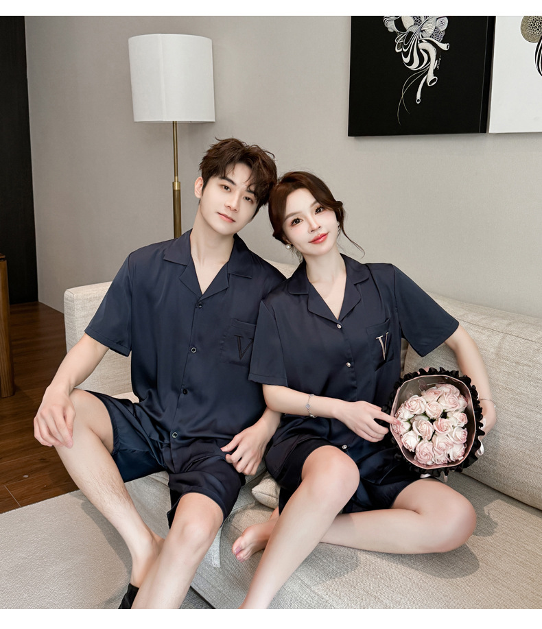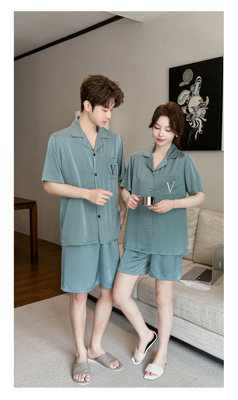 커플 잠옷 여성의 여름 아이스 실크 간단한 단색 짧은 소매 세트 2025 새로운 도착 잠옷 남자의 얇은 홈 옷스토어 가기
