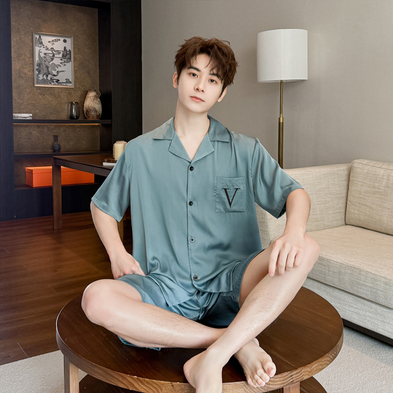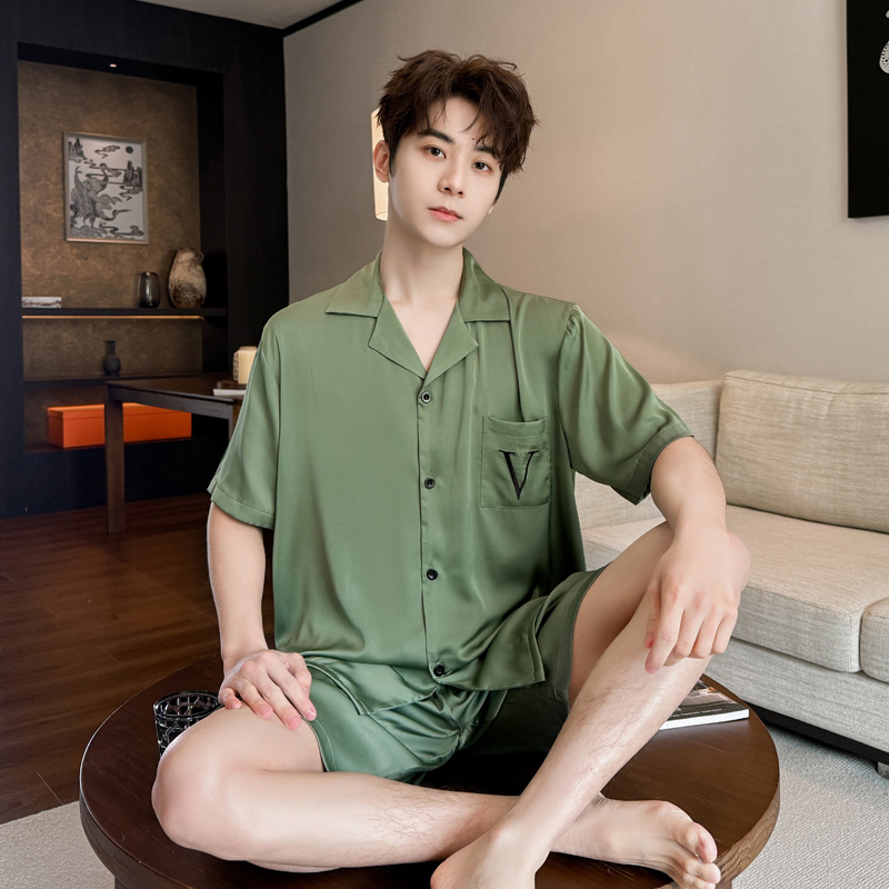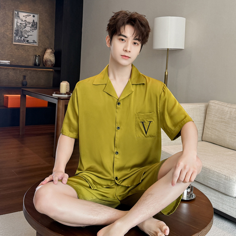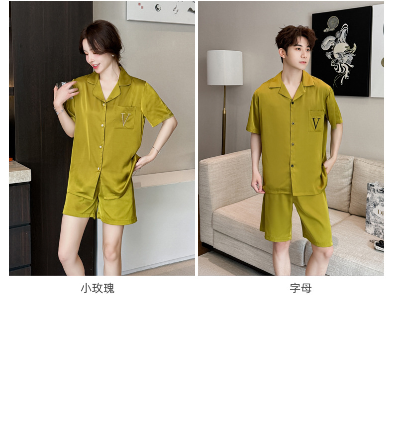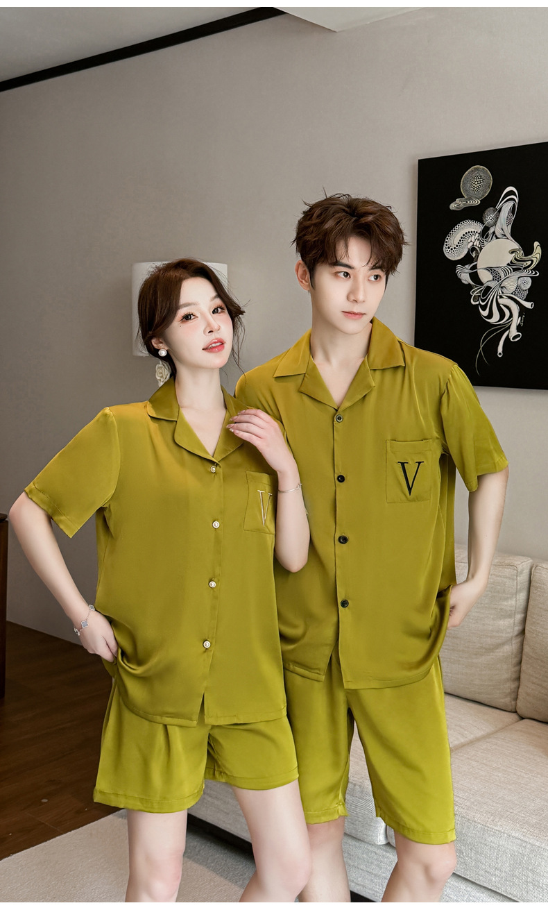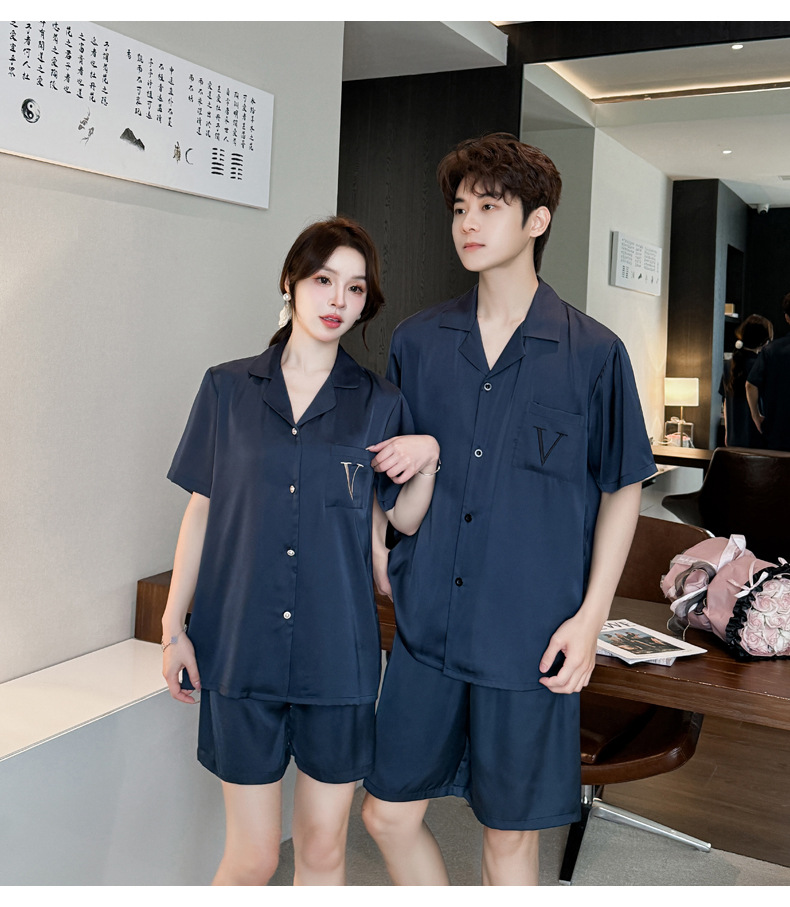 커플 잠옷 여성의 여름 아이스 실크 간단한 단색 짧은 소매 세트 2025 새로운 도착 잠옷 남자의 얇은 홈 옷스토어 가기