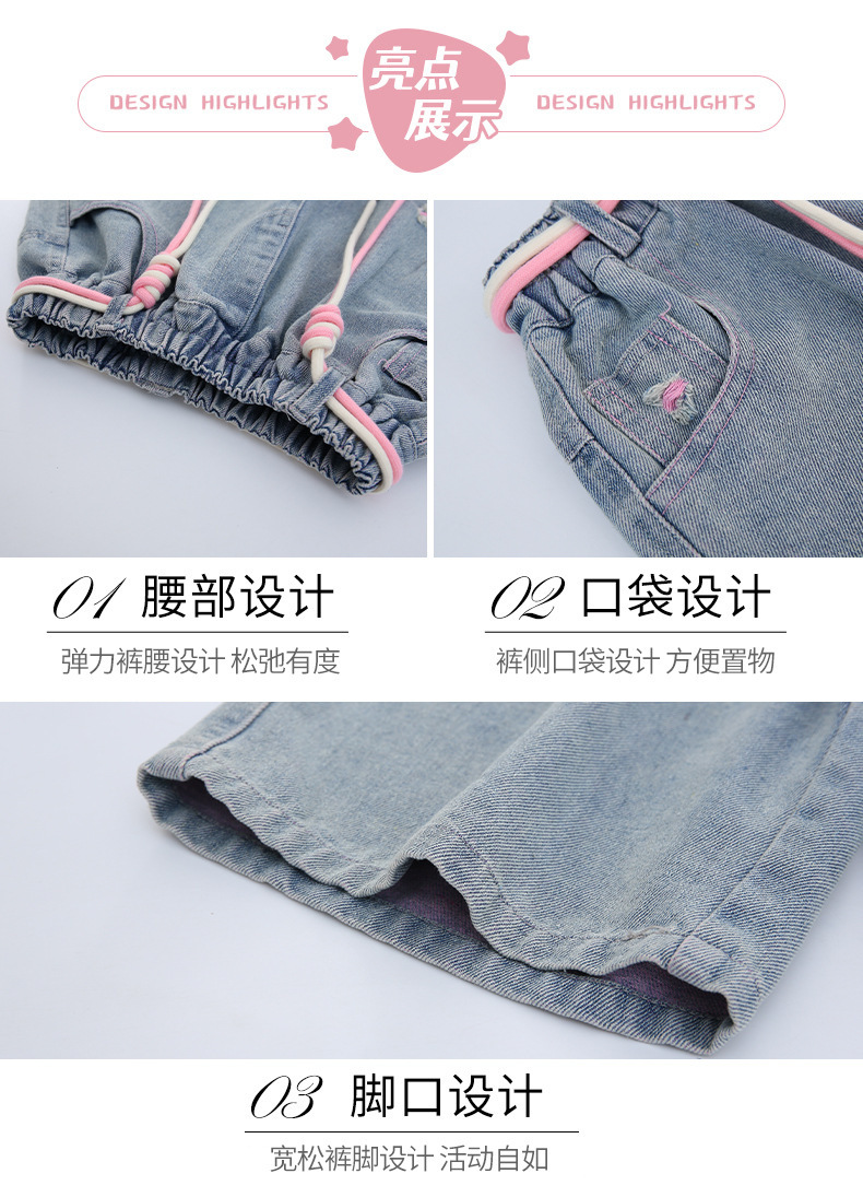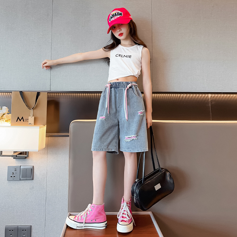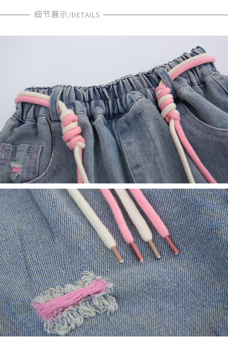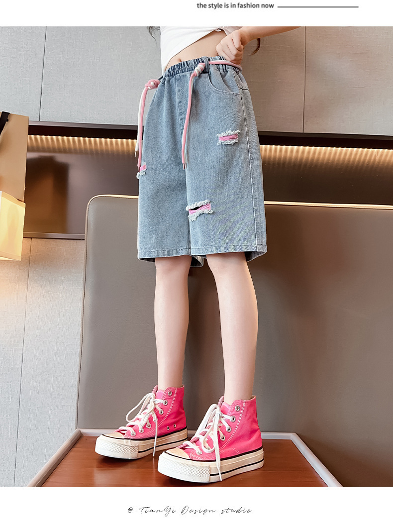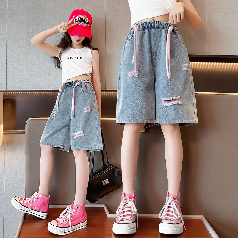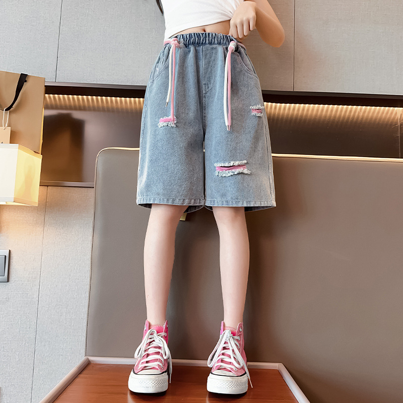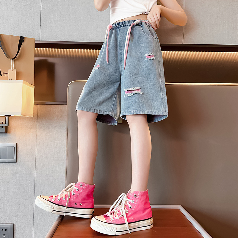 홀이 서양식 올 매치 반바지 홀이있는 중다 걸스 여름 얇은 데님 바지 느슨하고 편안한 허리 바지