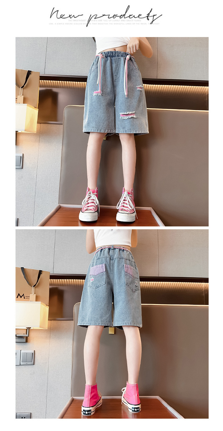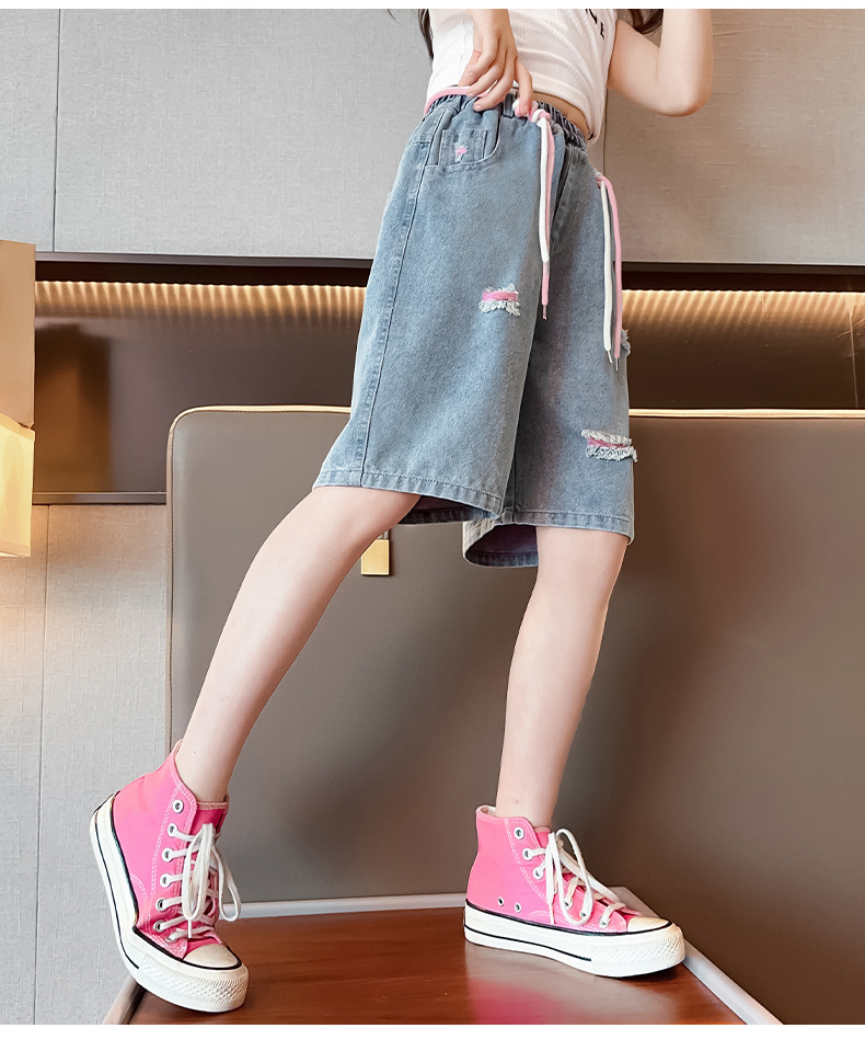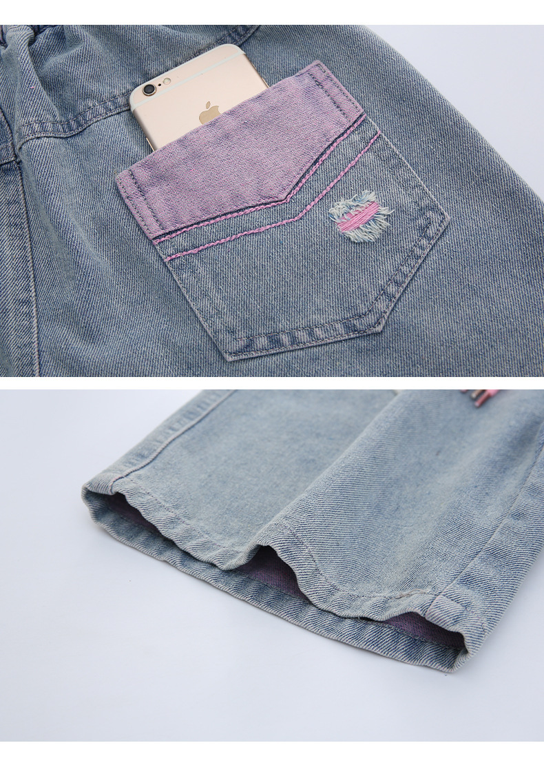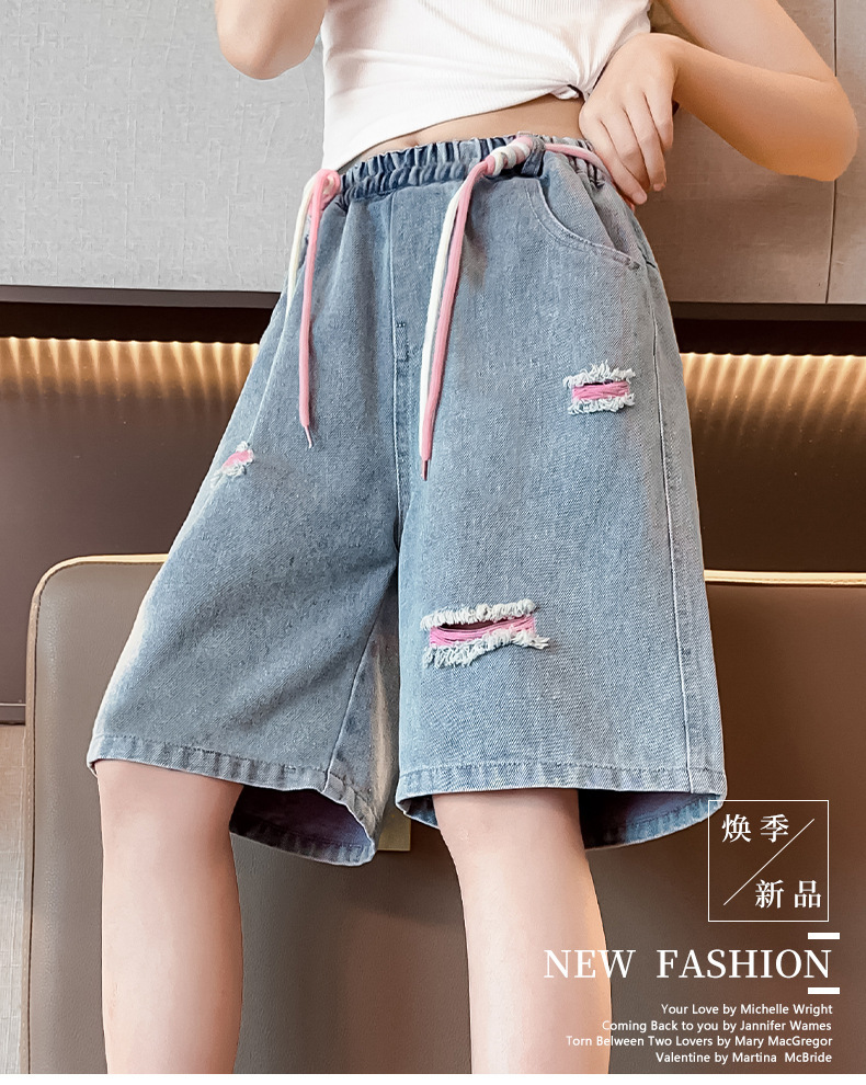 홀이 서양식 올 매치 반바지 홀이있는 중다 걸스 여름 얇은 데님 바지 느슨하고 편안한 허리 바지스토어 가기