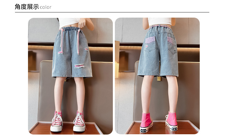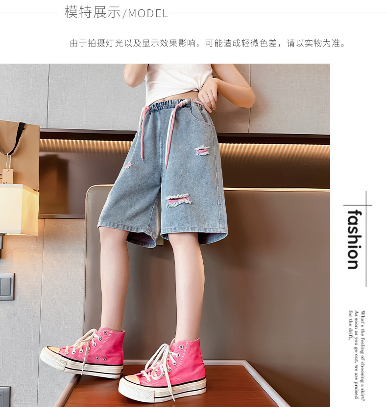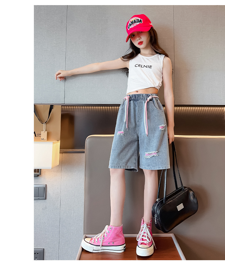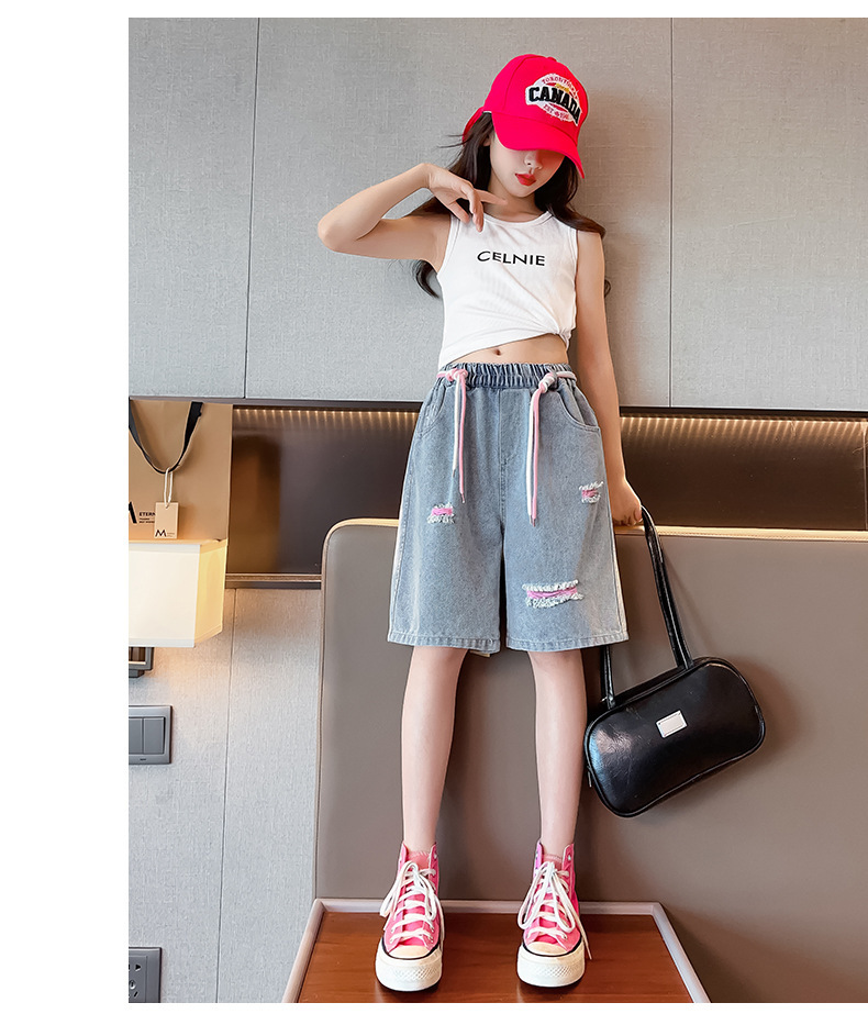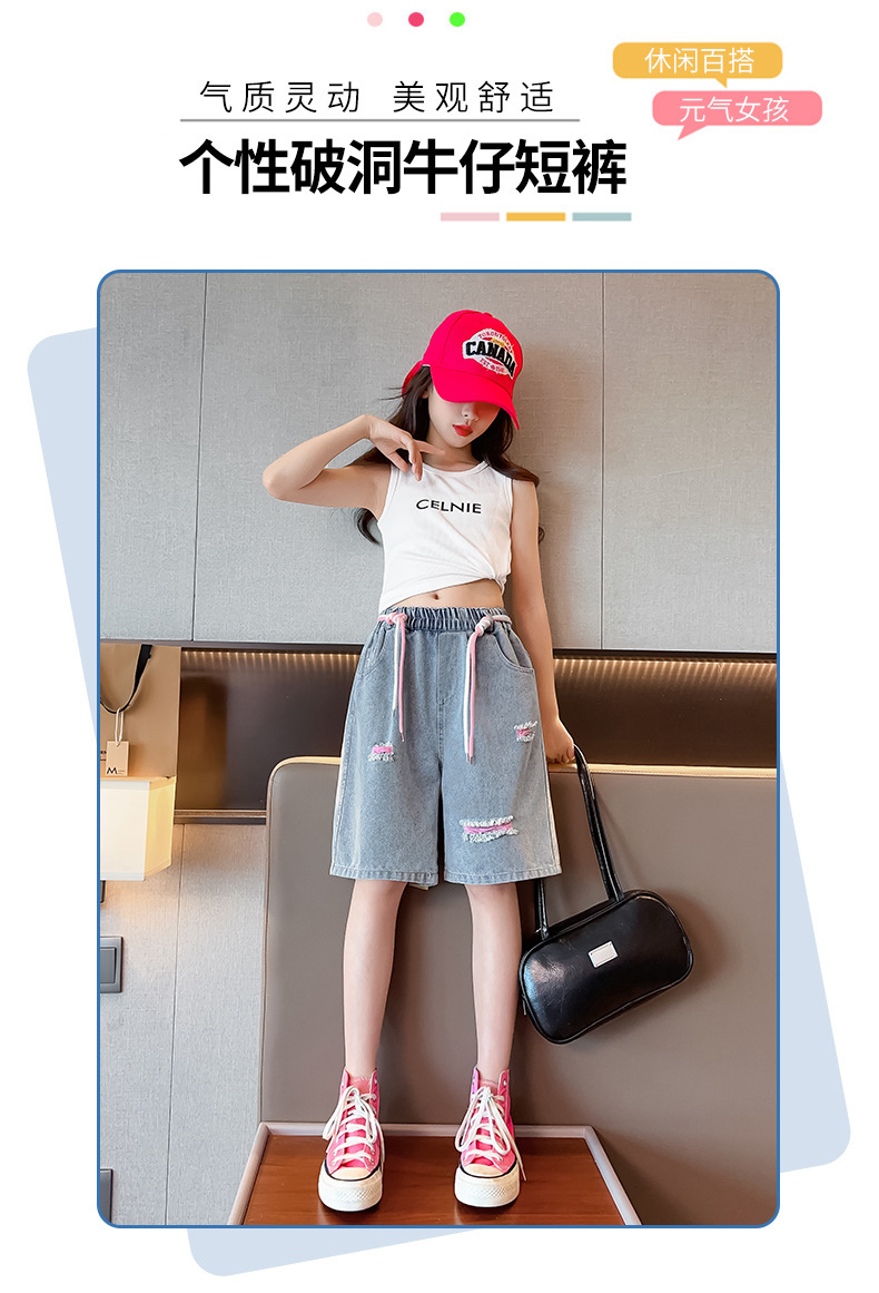 홀이 서양식 올 매치 반바지 홀이있는 중다 걸스 여름 얇은 데님 바지 느슨하고 편안한 허리 바지스토어 가기