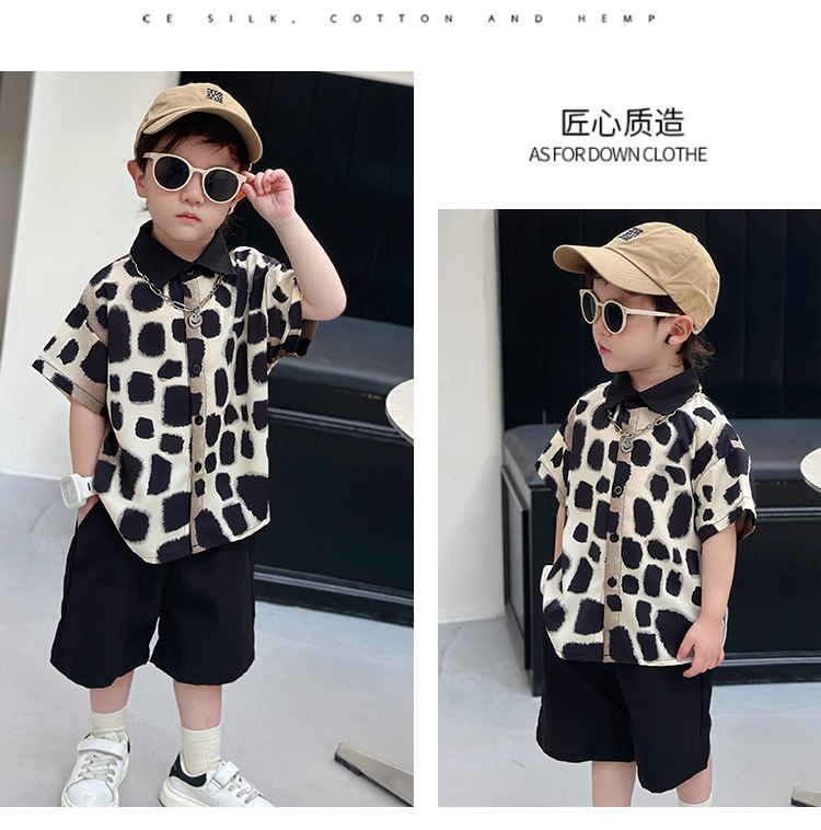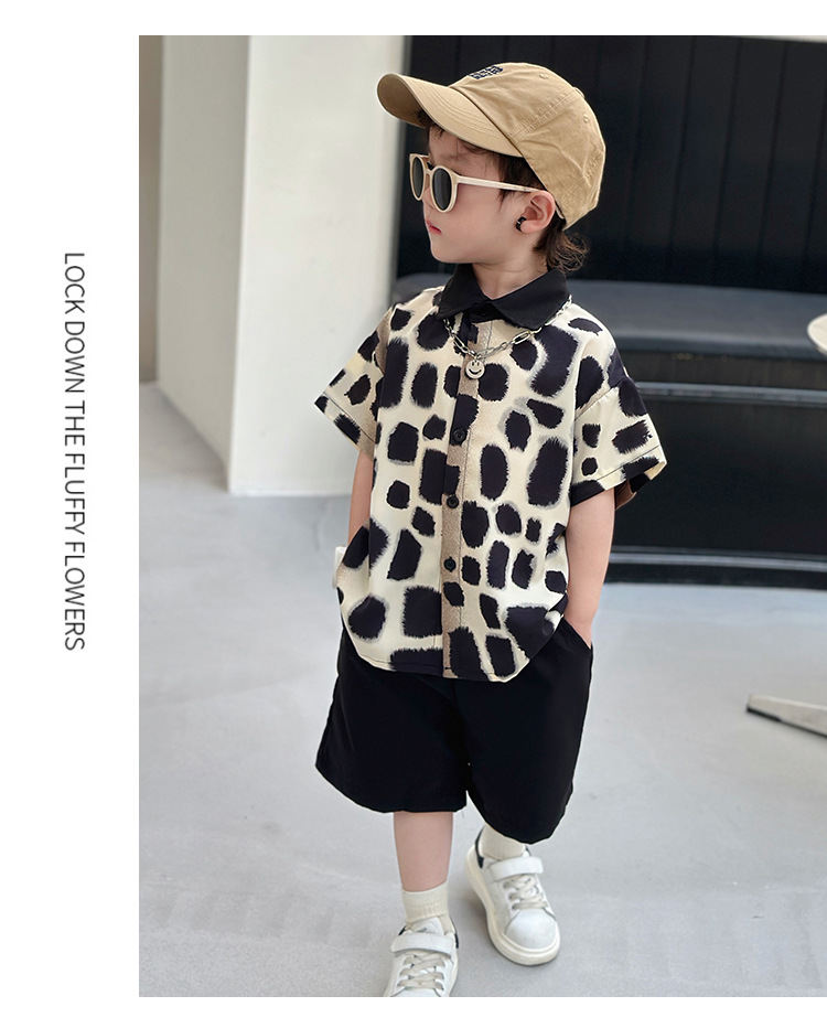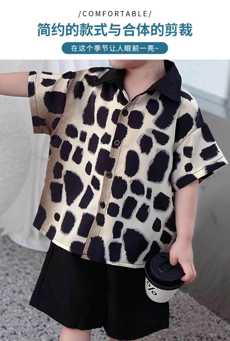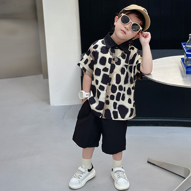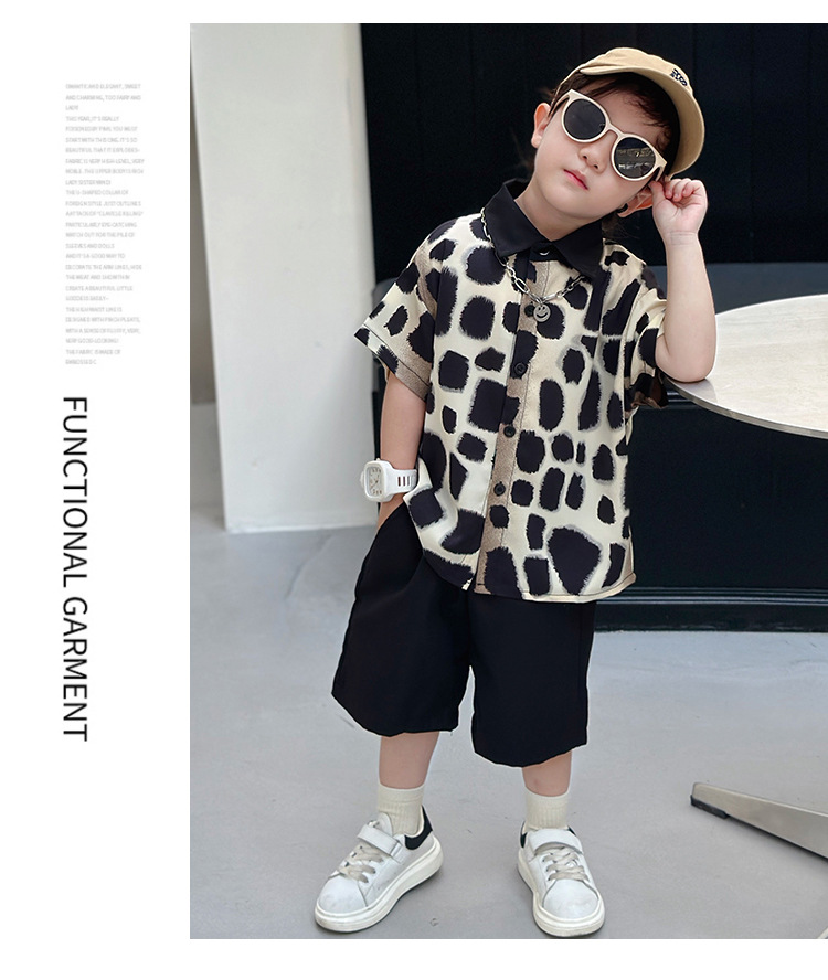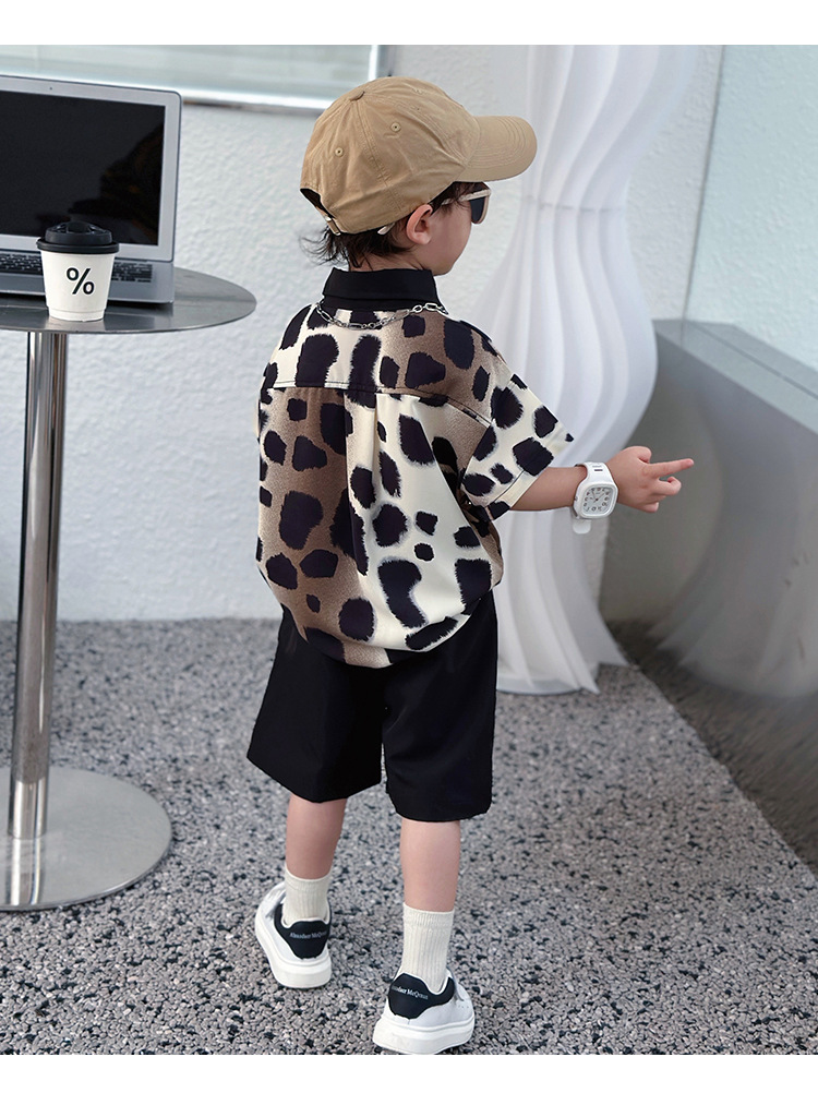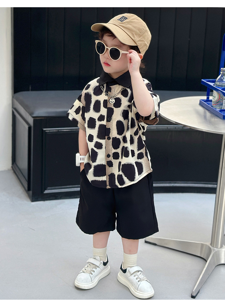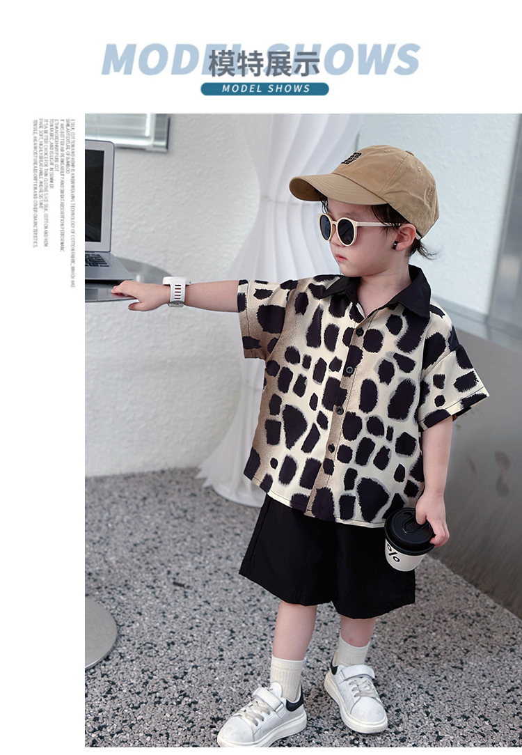 아동복, 남아 여름 패셔너블 그라데이션 레오파드 프린트 셔츠 투피스 세트, 멋진 여름 스타일, 스트리트 패션 아동복, 트렌디한 의류스토어 가기