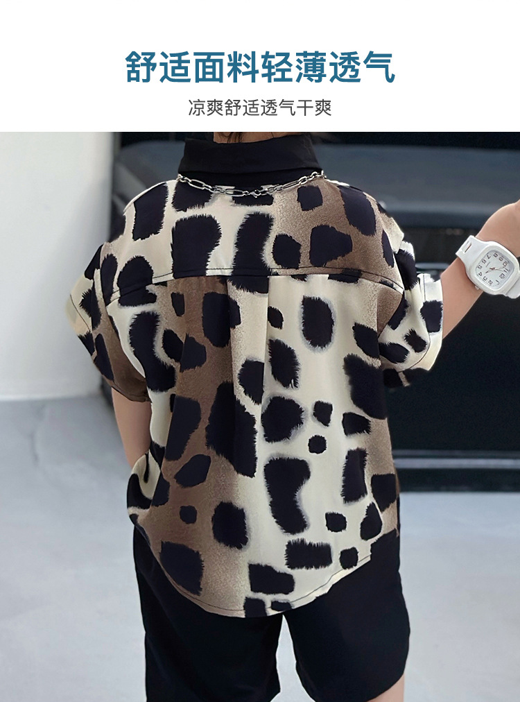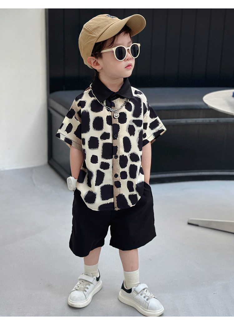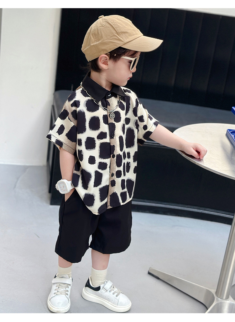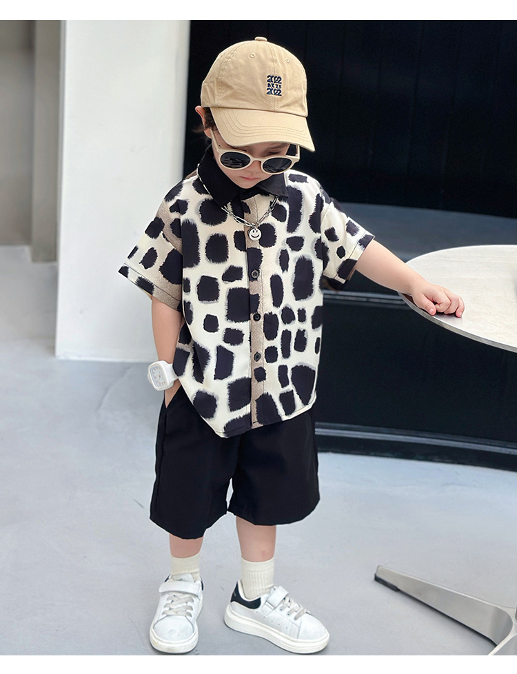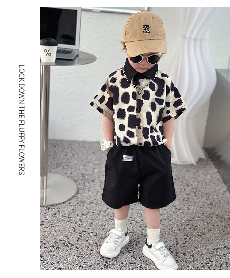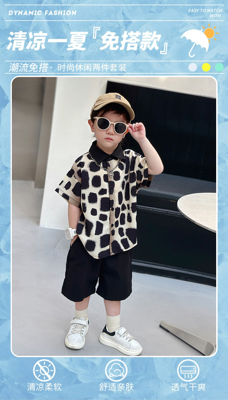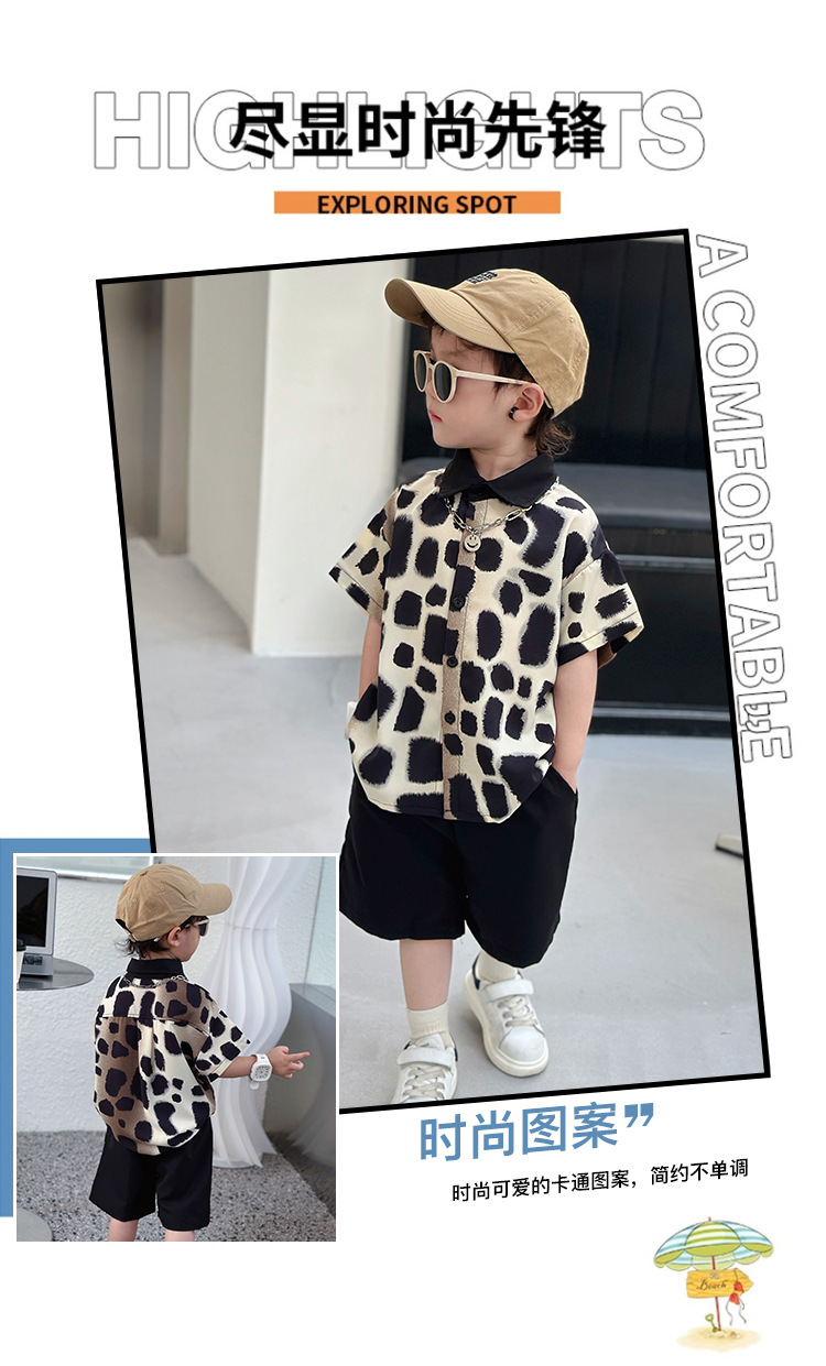 아동복, 남아 여름 패셔너블 그라데이션 레오파드 프린트 셔츠 투피스 세트, 멋진 여름 스타일, 스트리트 패션 아동복, 트렌디한 의류스토어 가기