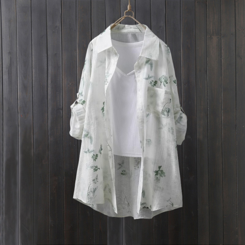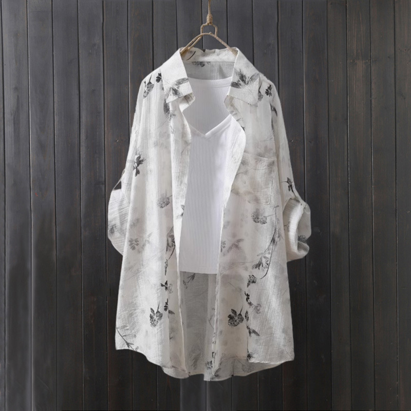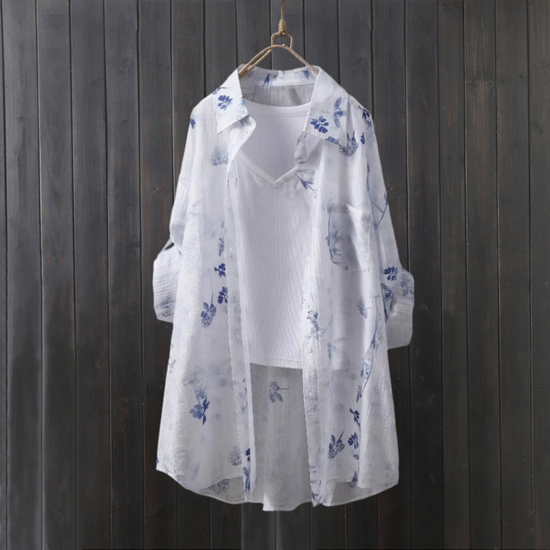 중국식 인쇄 된 태양 보호 의류 텐셀 셔츠 여성의 여름 느슨한 얇은 외부 적합 에어컨 셔츠 여성용 탑스토어 가기
