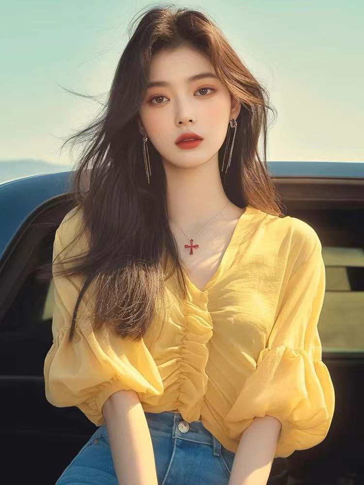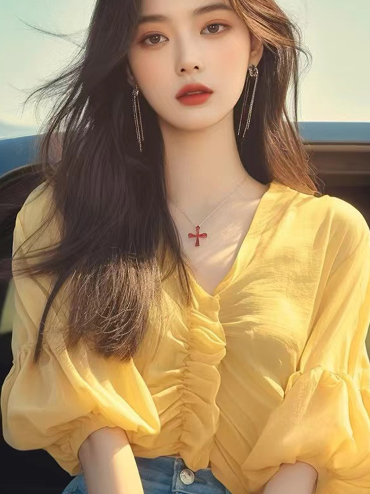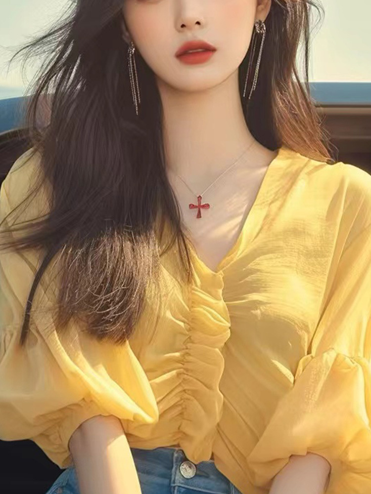 버블 슬리브 쉬폰 셔츠 여성용 여름 반팔 2025 새로운 V 넥 셔츠 느슨한 우아한 고급 노란색 탑