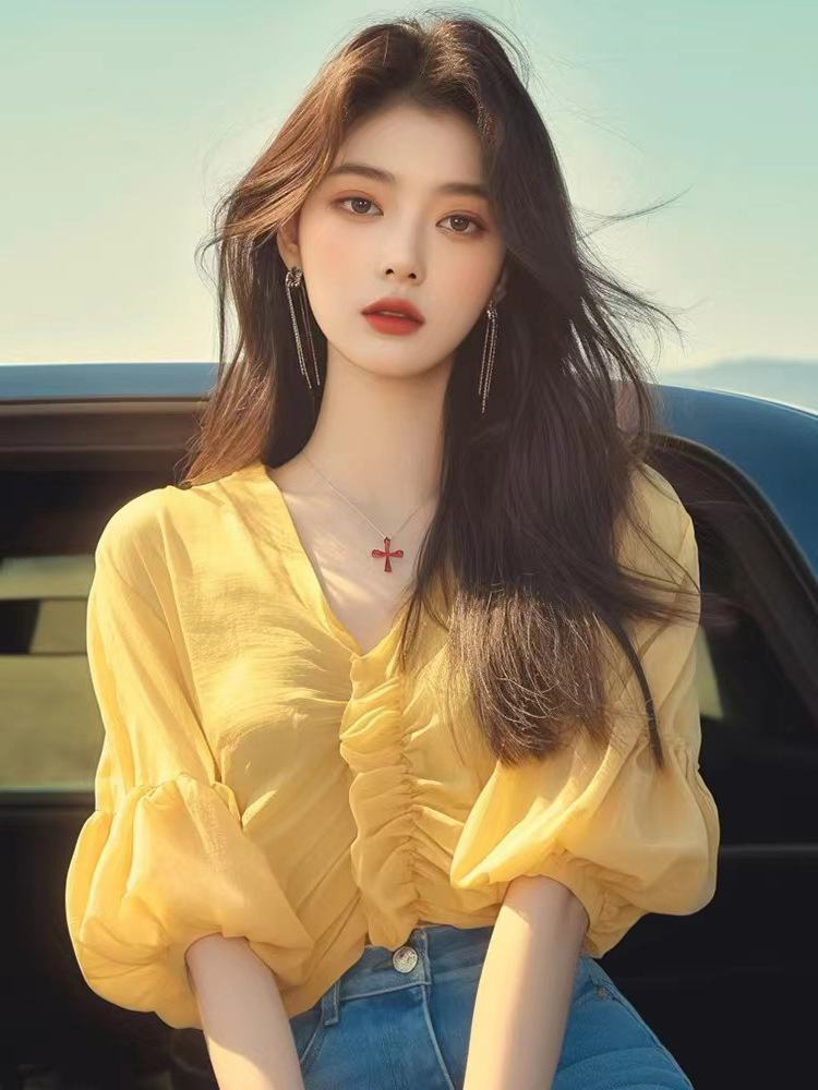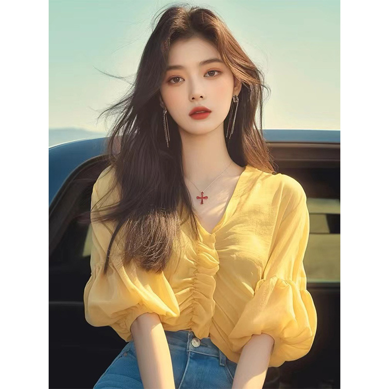 버블 슬리브 쉬폰 셔츠 여성용 여름 반팔 2025 새로운 V 넥 셔츠 느슨한 우아한 고급 노란색 탑스토어 가기