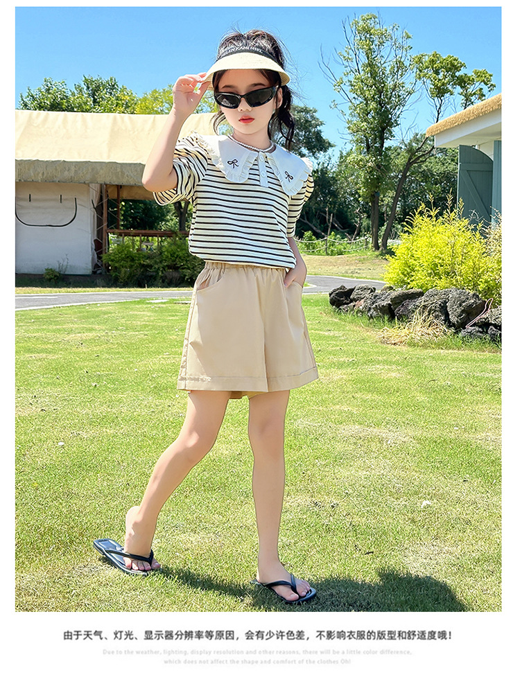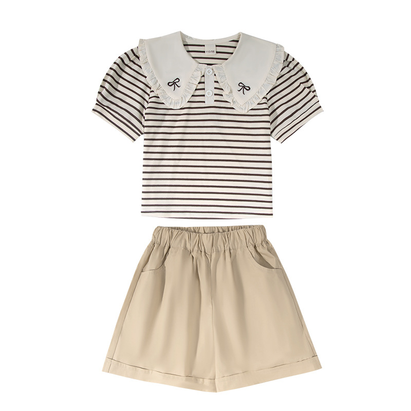 큰 어린이를위한 고품질 소녀 여름 줄무늬 양복 2025 여름 새로운 반팔 셔츠와 반바지 투피스 세트