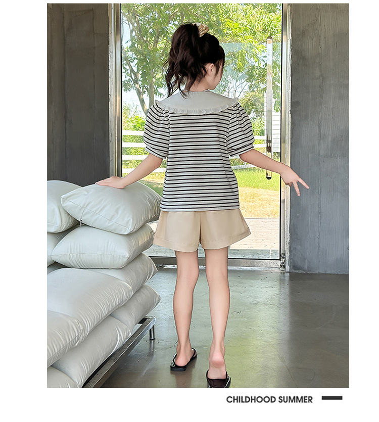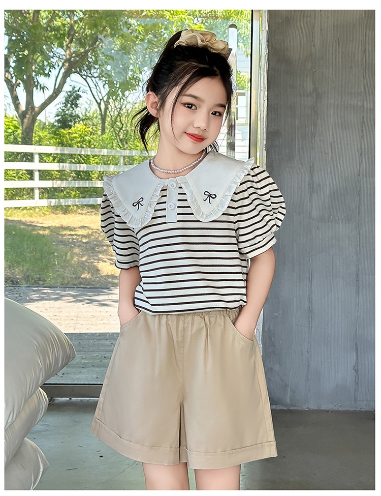 큰 어린이를위한 고품질 소녀 여름 줄무늬 양복 2025 여름 새로운 반팔 셔츠와 반바지 투피스 세트스토어 가기