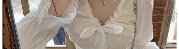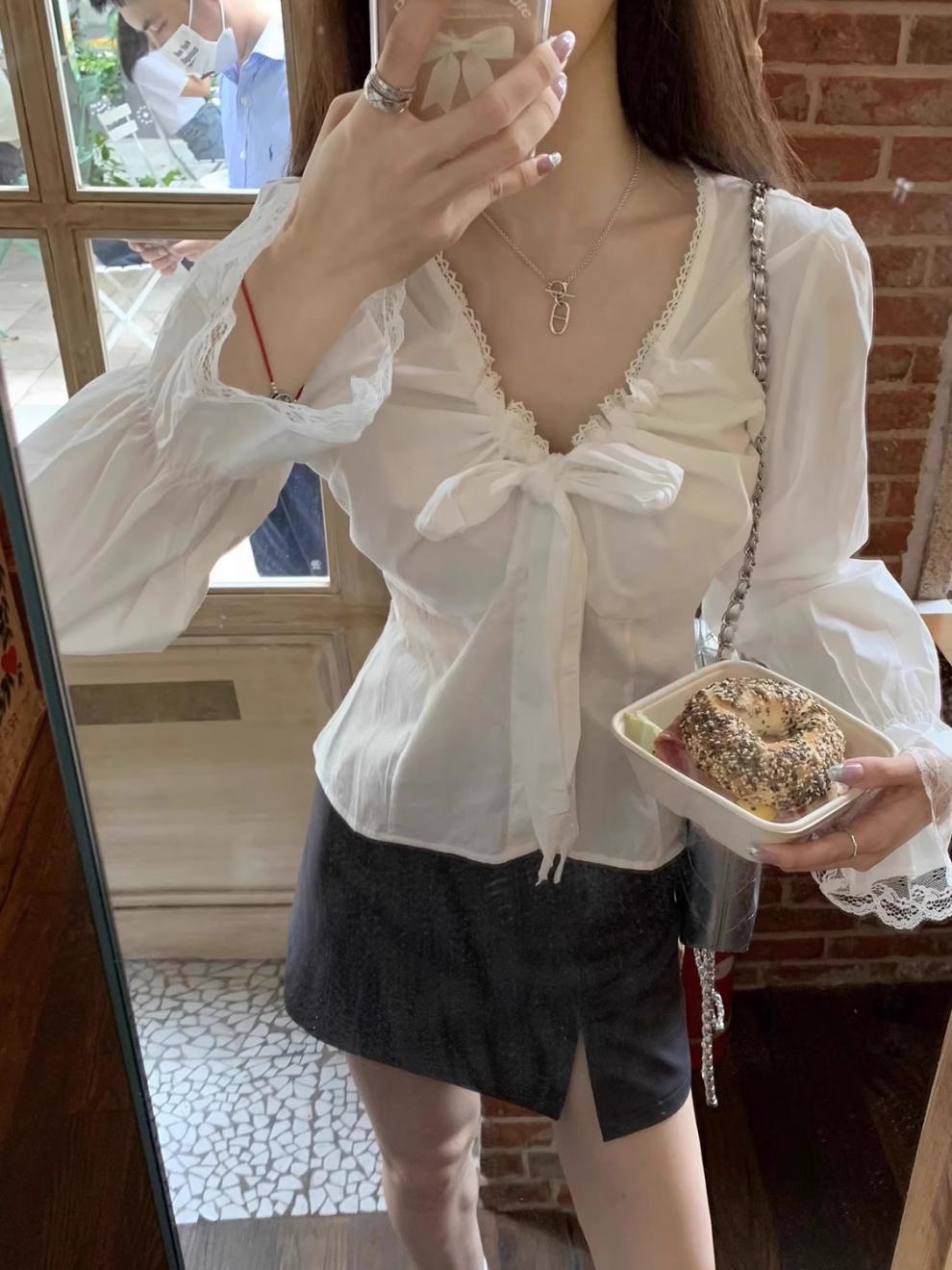 흰색 허리 셔츠 여성의 봄과 가을 새로운 프랑스 스타일 레이스 V-Neck 디자인 센스 긴 소매 슬림 세련된 탑스토어 가기