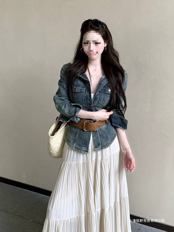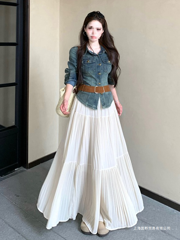 2025 신상 레트로 홍콩 스타일 핫걸 데님 상의 세트 여성용 봄 하이웨이스트 플리츠 롱 스커트