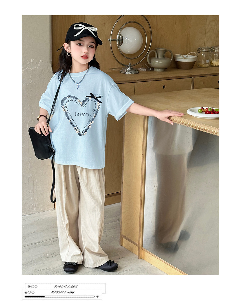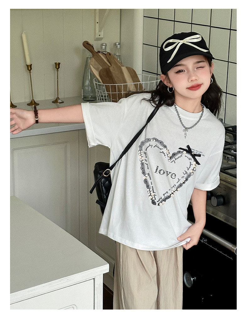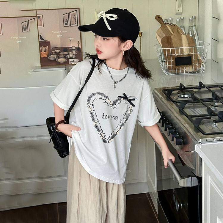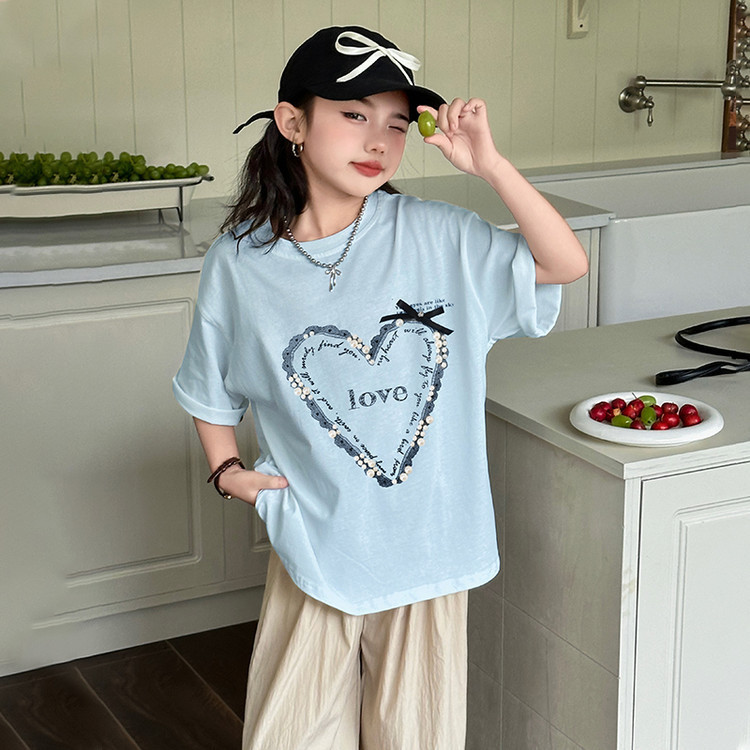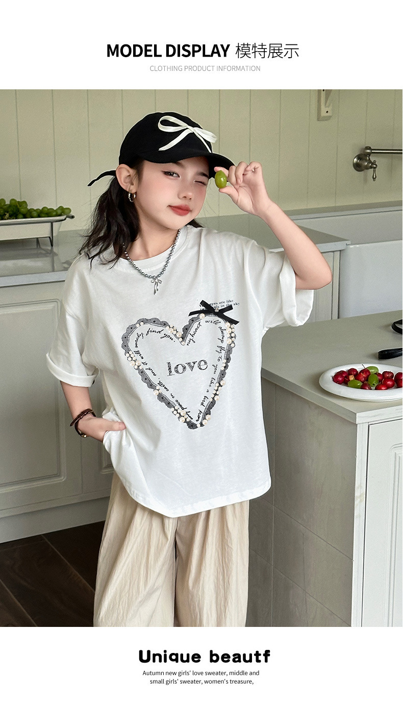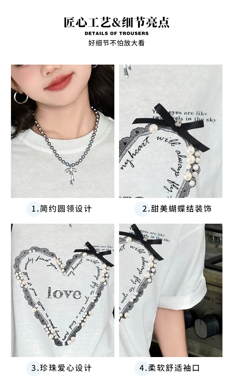 한국 새 티셔츠 진주 소녀 여름 중공업 2025 라운드 목 활 짧은 소매 캐주얼 사랑