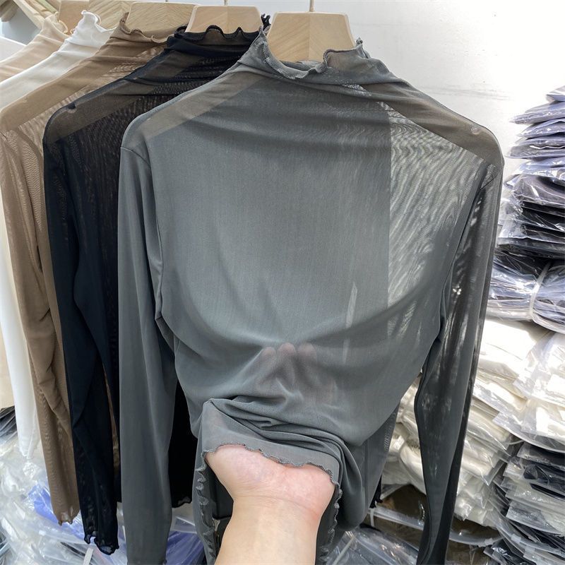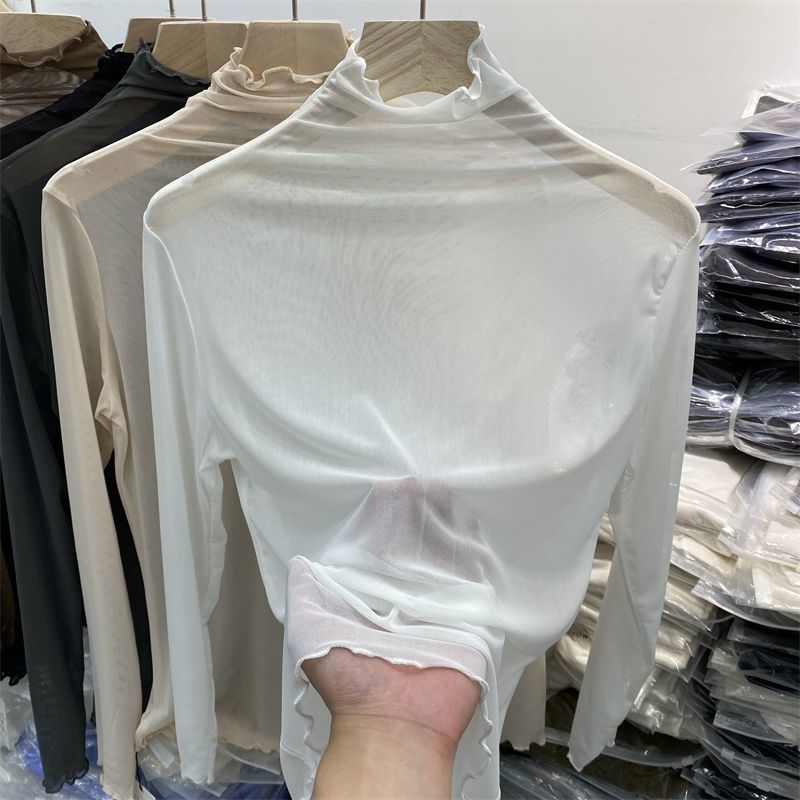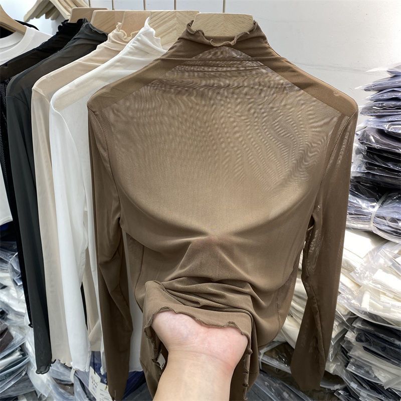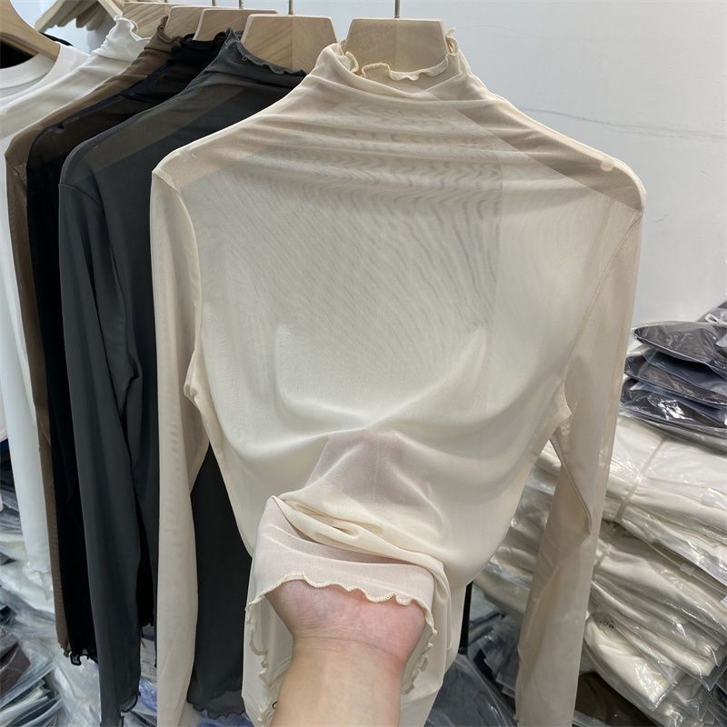 여성용 하이넥 레이스 메쉬 밑단 셔츠, 긴팔 2025 신작 봄, 가을 쉬폰 셔츠, 거즈 레이어드 탑스토어 가기