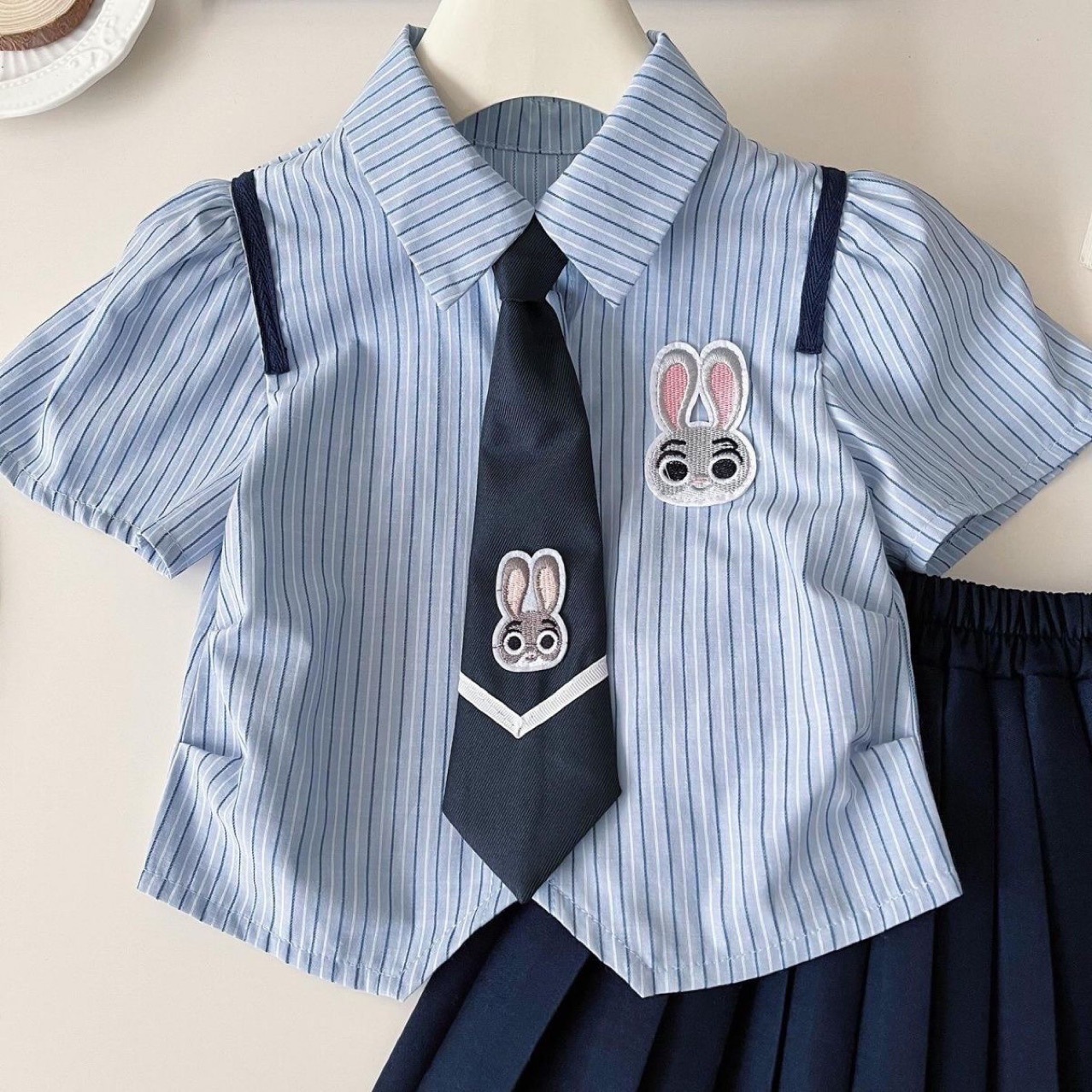 2025 여름 줄무늬 만화 대학 스타일 소녀 원피스 귀여운 토끼 유니폼 짧은 소매 셔츠 원피스 세트