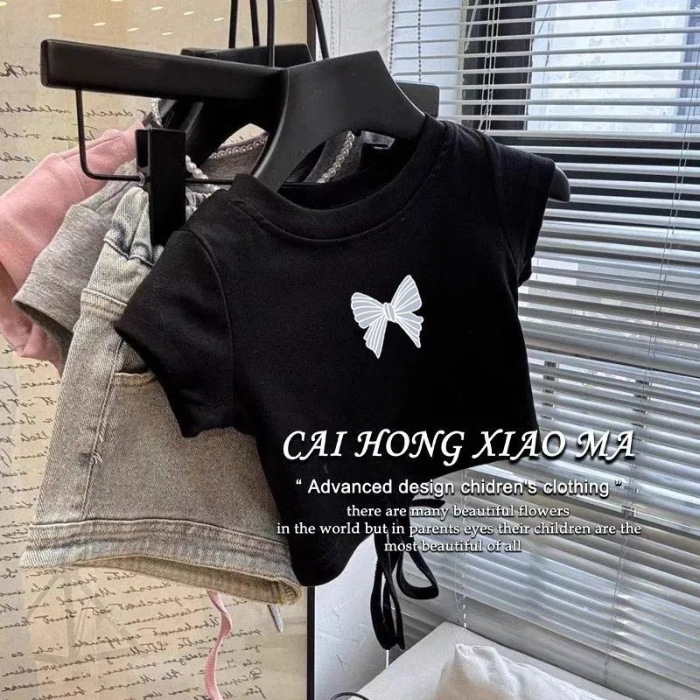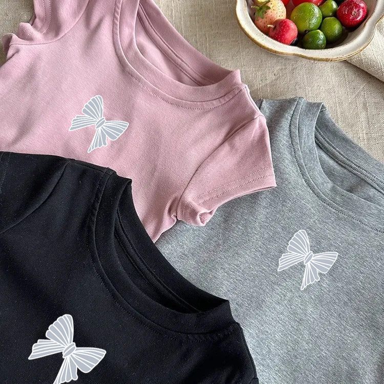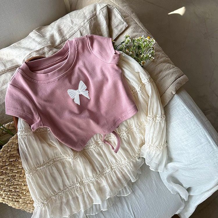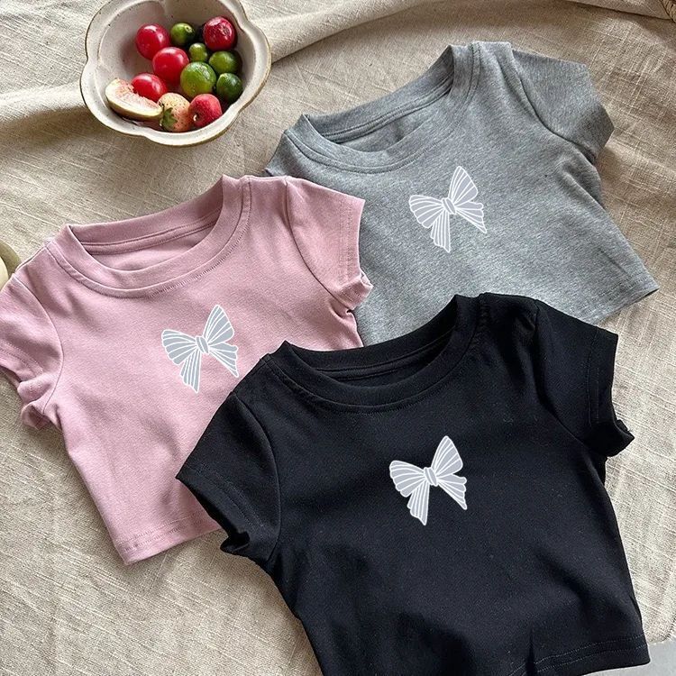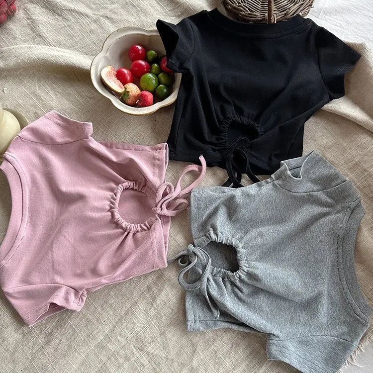 코튼 걸스 보우 백리스 티셔츠 25 여름 한국 스타일 반팔 탑 패셔너블하고 트렌디한 바닥 셔츠