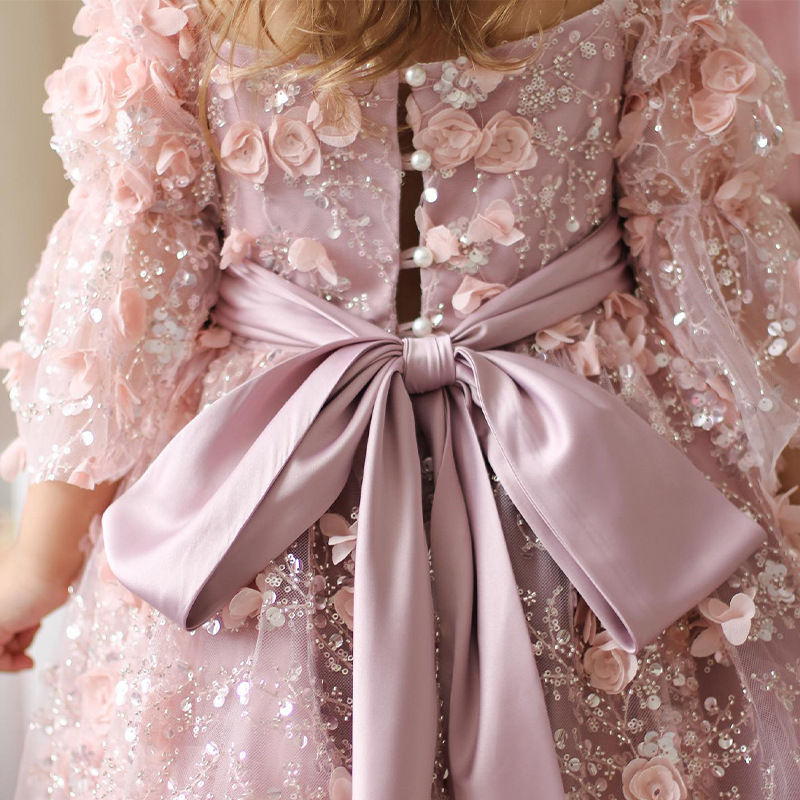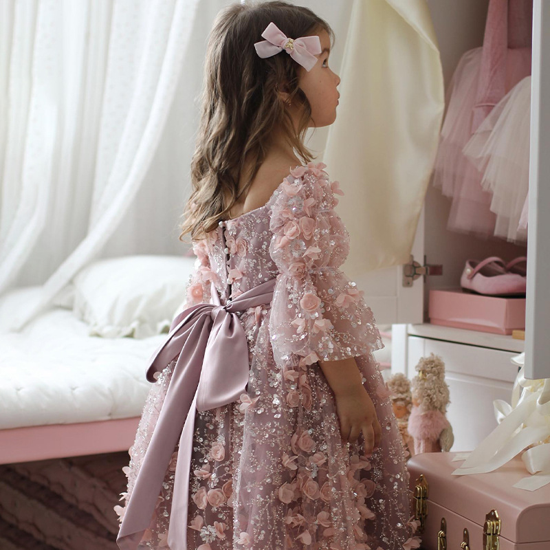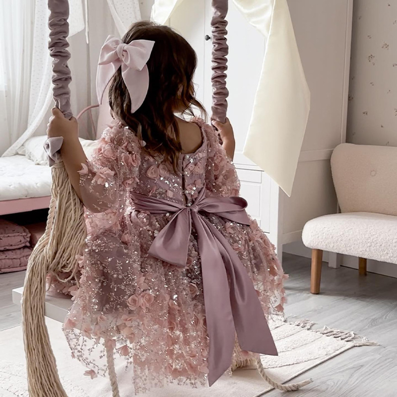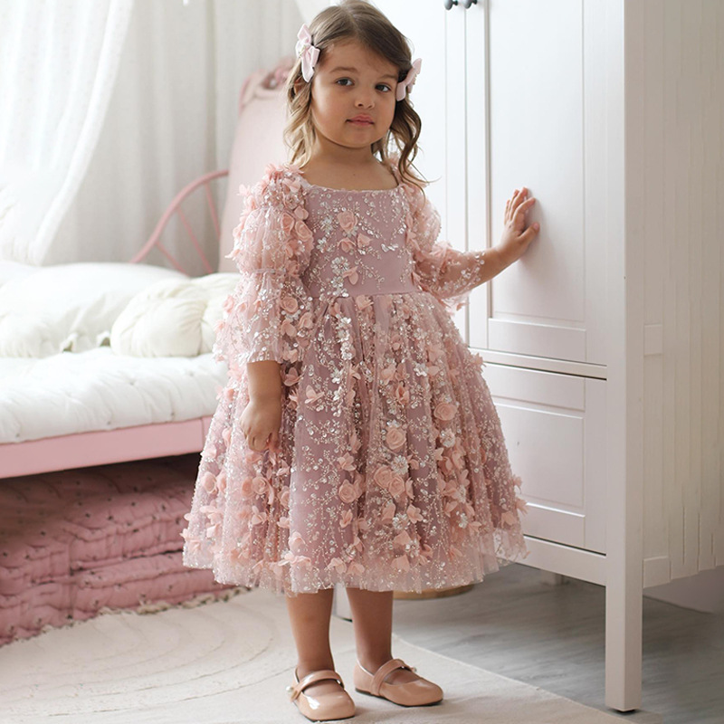 소녀의 핑크 진주 스팽글 드레스 어린이 3D 꽃 5부 소매 메쉬 공주 드레스 웨딩 드레스