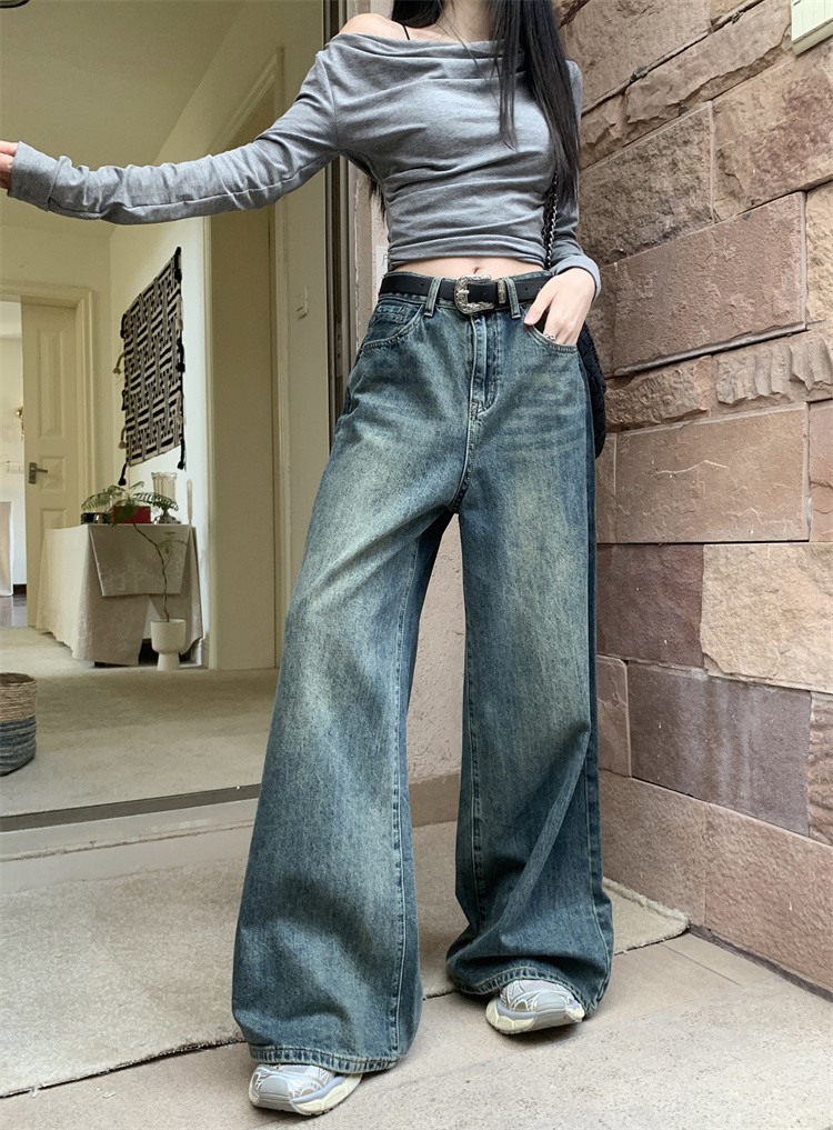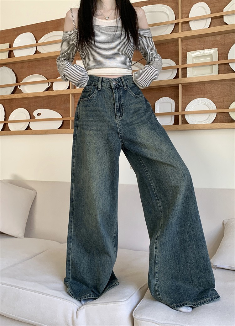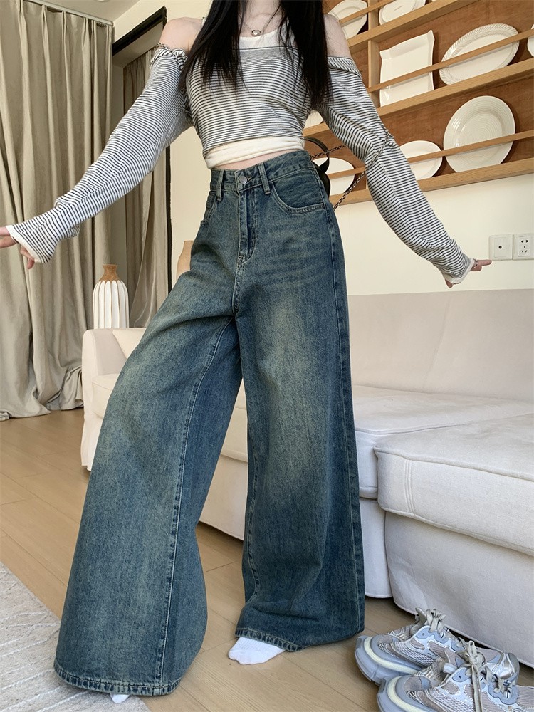 145 여성용 짧은 복고풍 하이 웨이스트 와이드 레그 청바지, 루즈하고 슬림한 스트레이트 레그 바닥 길이 바지, 트렌디스토어 가기