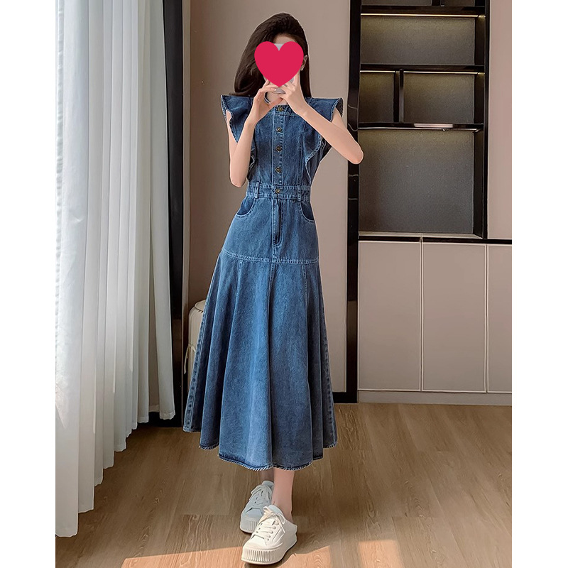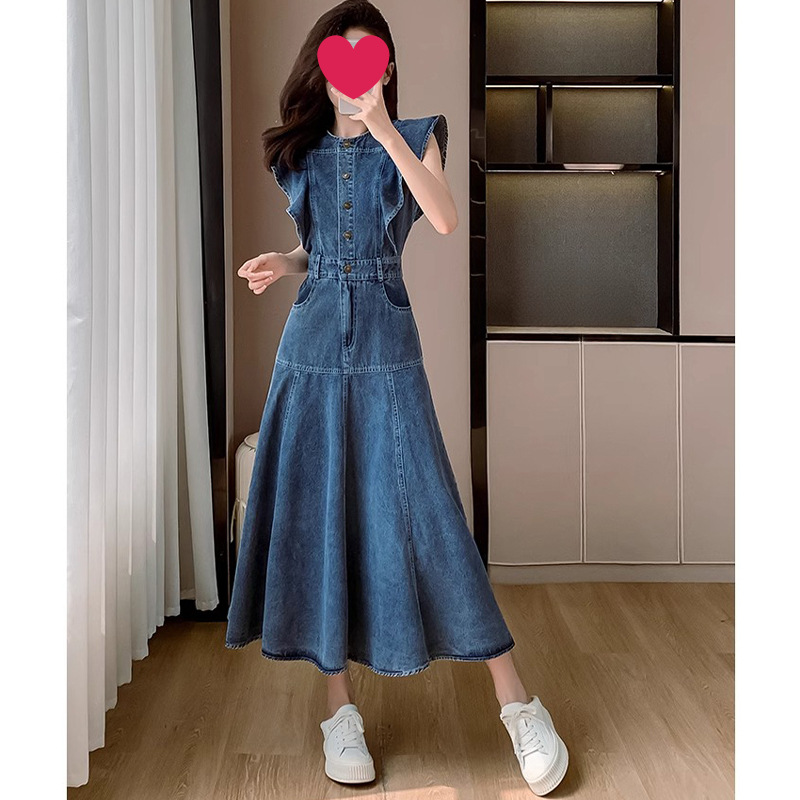 2025 년 여름 새로운 여성 복고풍 우아한 허리 원피스 여성 왕실 자매 빛 성숙한 바람 비행 소매 데님 원피스스토어 가기
